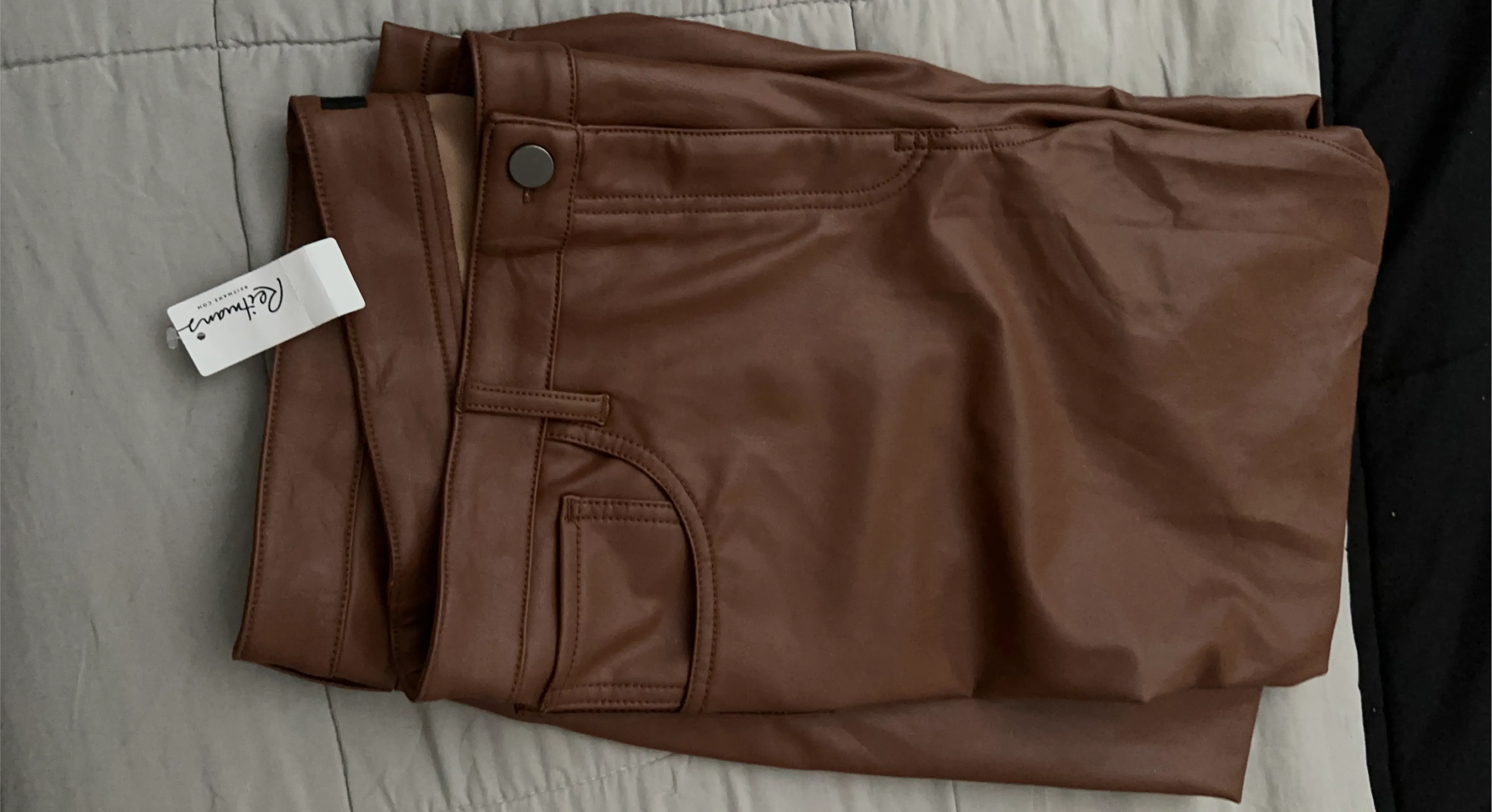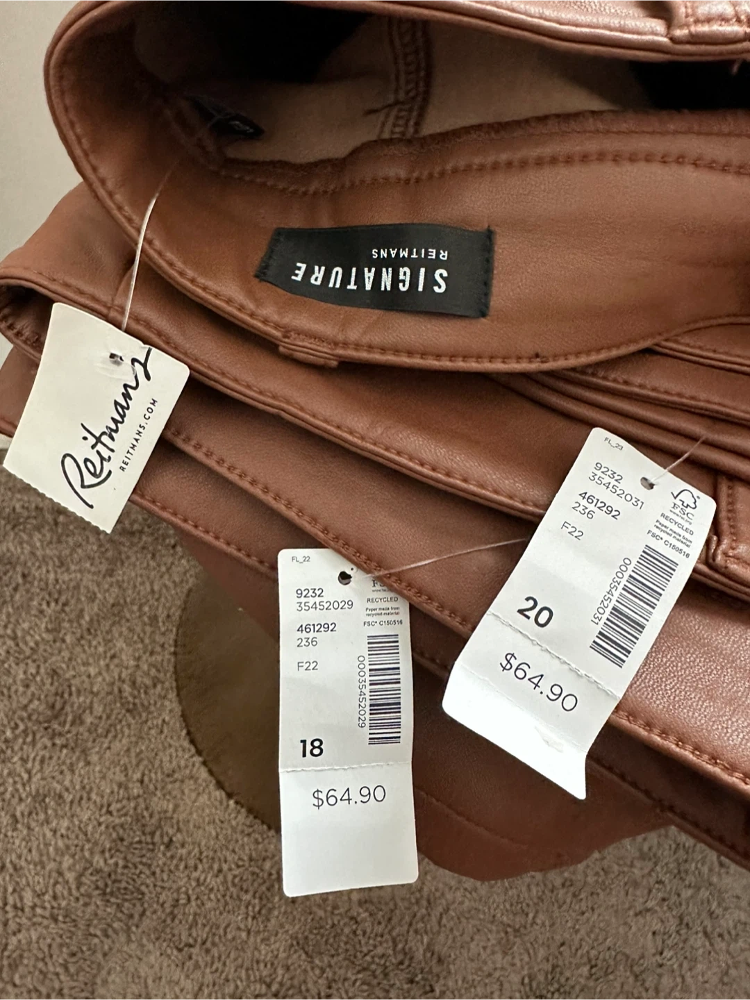 Selling 3 new pairs of Reitmans Signature faux leather pants in size 16, 18 and 20. They're a beautiful brown colour . Originally bought for $64.90.