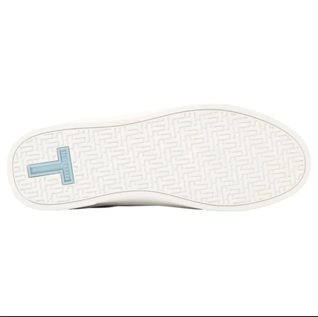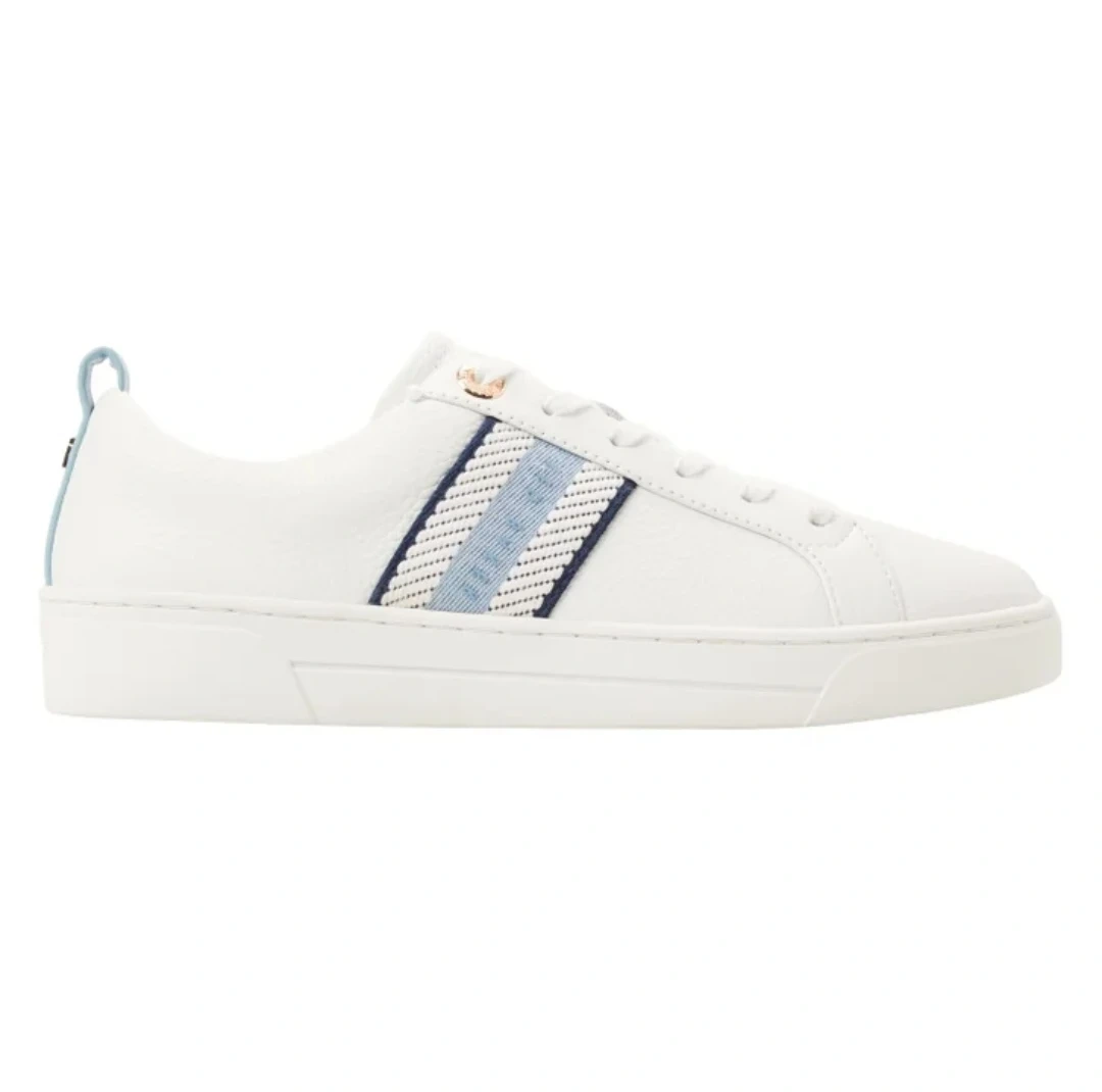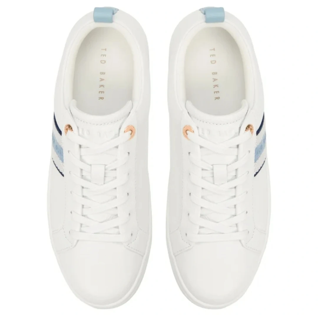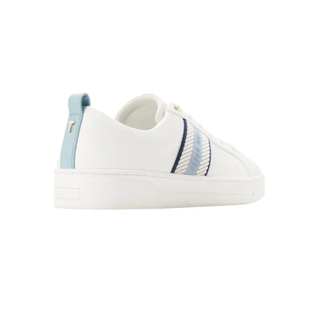 Selling a pair of Ted Baker leather sneakers in white. They feature a stylish blue stripe accent and are in great condition. Perfect for adding a touch of class to any casual outfit!