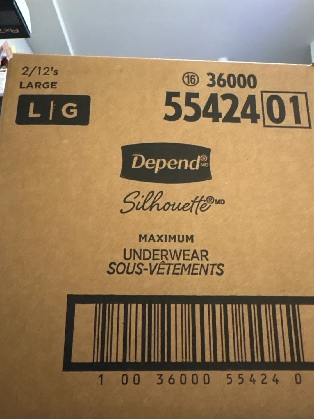 Selling a box of Depend Silhouette MD Underwear in size Large. It's a maximum absorbency product, perfect for those who need it. The box is marked with the number 5542401. There are 2 packages in each box. You will be getting 2x12.