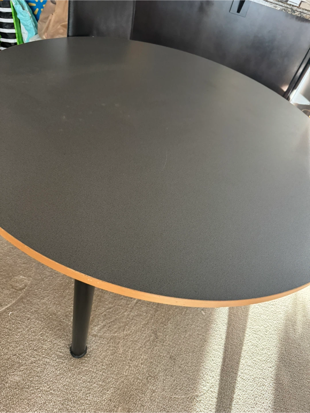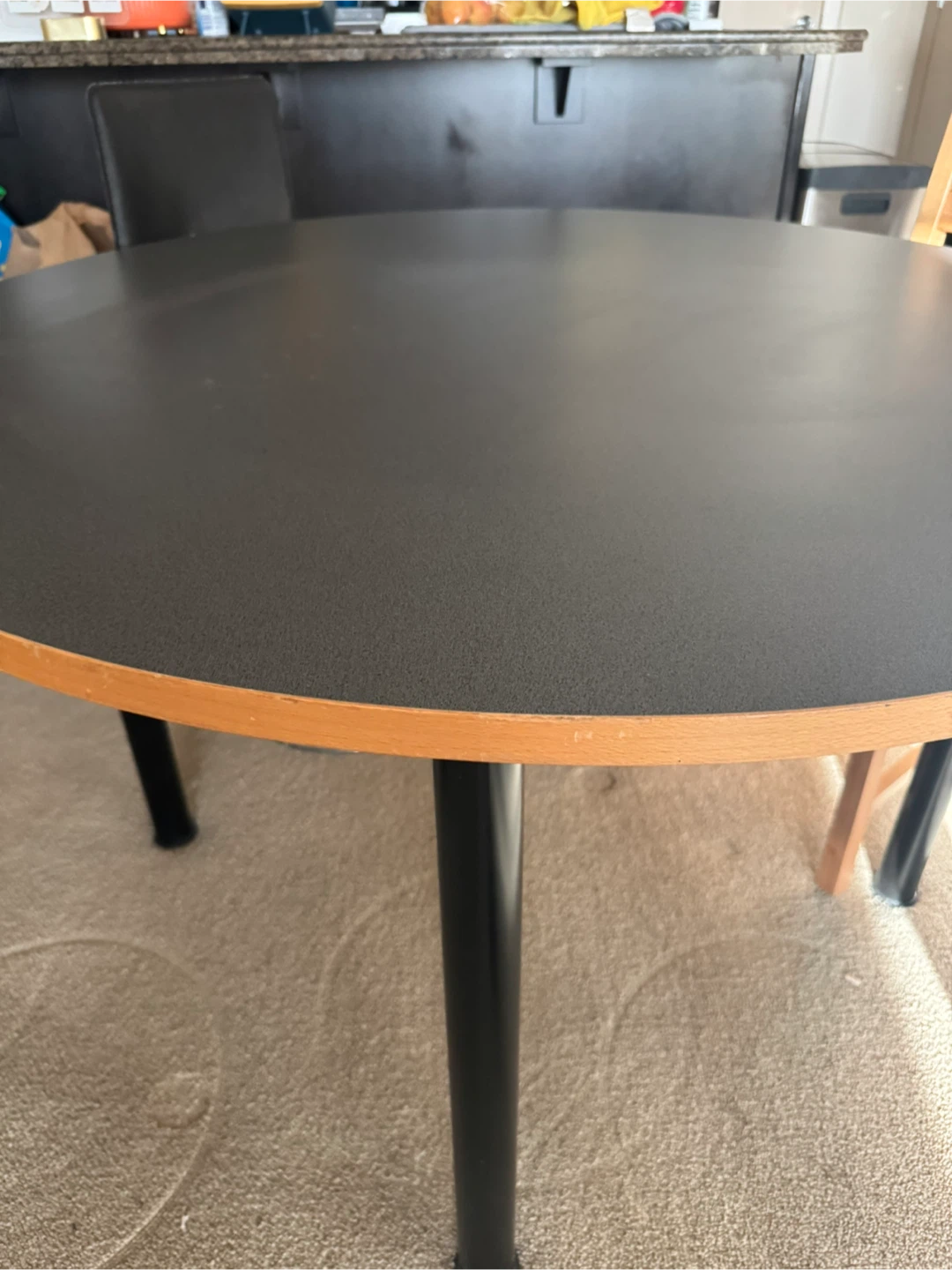 Selling a round dining table with a black top and black legs. It's in good condition and would be perfect for small dining area or kitchen.