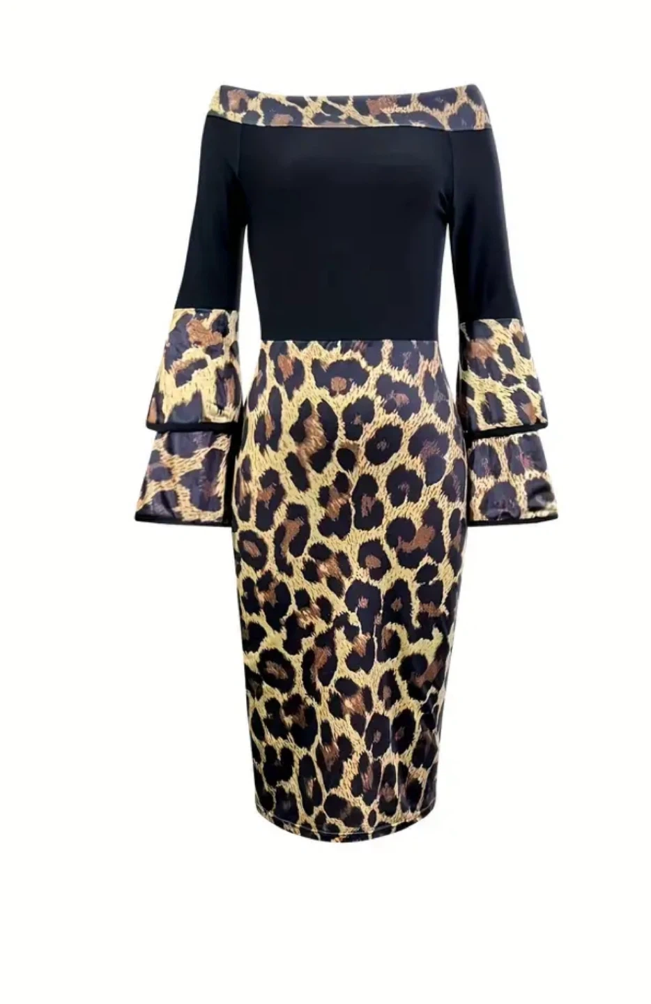 This dress features a unique leopard print design. It has a black bodice with long sleeves and a leopard print skirt. The sleeves have a layered ruffle detail, adding a touch of elegance to the overall look
