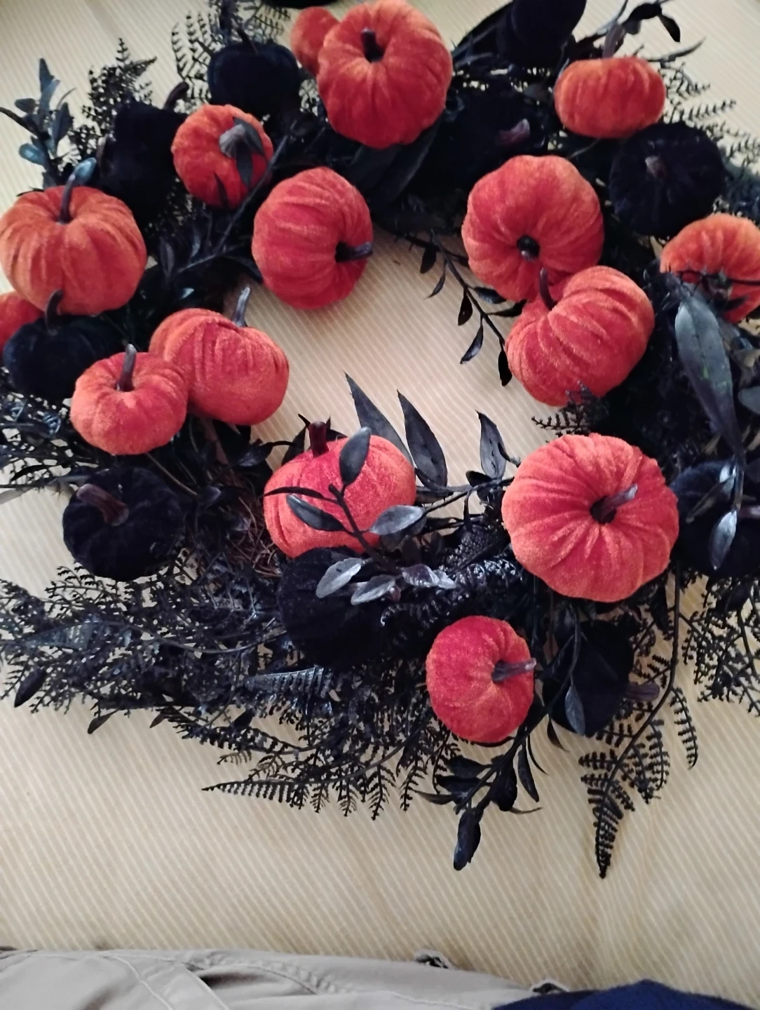 Add some spooky charm to your home with this Halloween pumpkin wreath! It features a mix of orange and black pumpkins nestled among black foliage. Perfect for your front door or as a festive wall decoration during the fall season