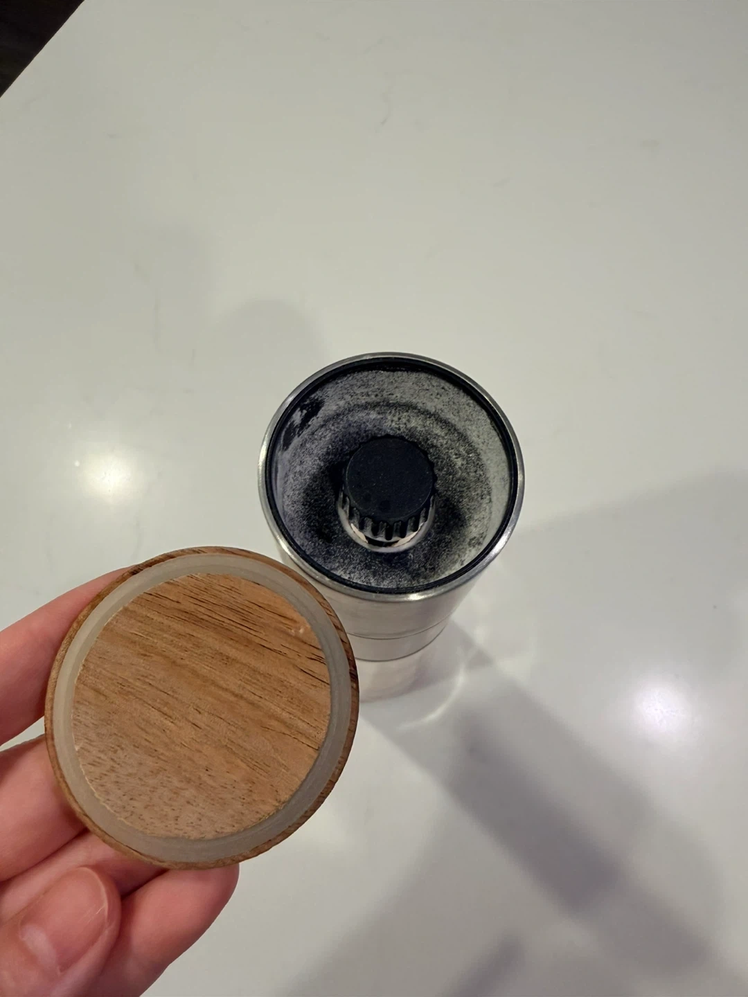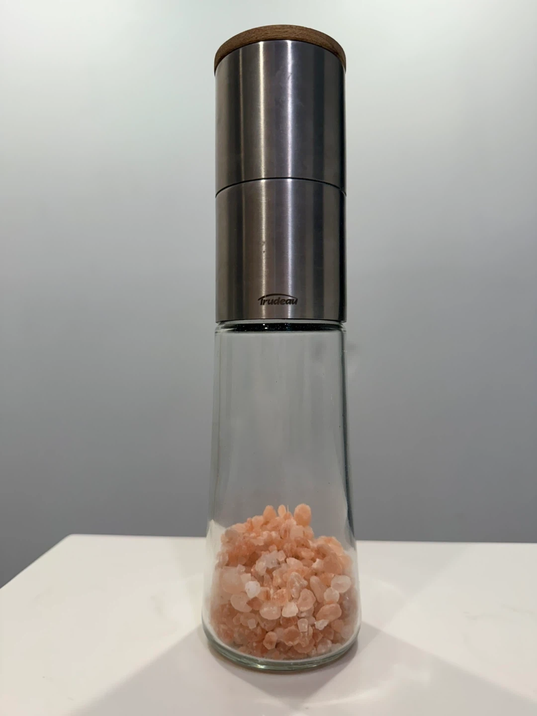 I'm selling a Trudeau salt mill, perfect for adding freshly ground salt to your meals! It comes with Himalayan pink salt already inside, so it's ready to use right away. The mill is in great condition and features a wooden lid and a glass base.