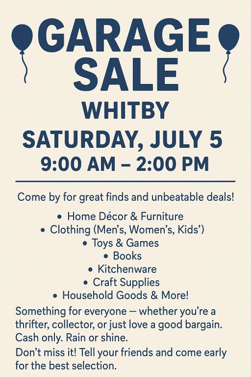 ๐ Garage Sale โ Whitby โ Saturday, July 5th! ๐