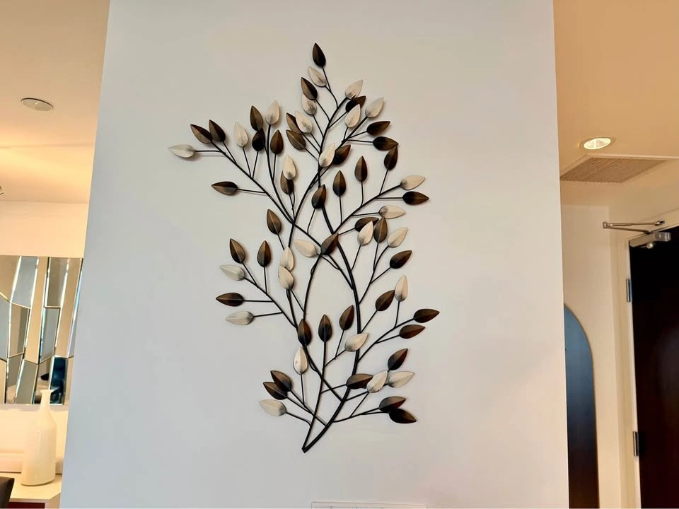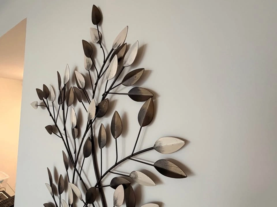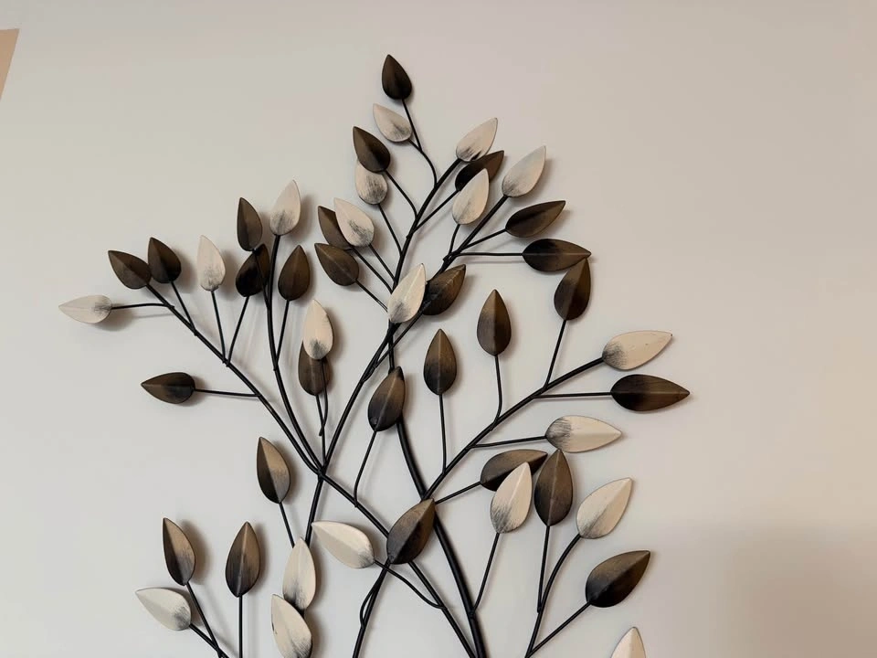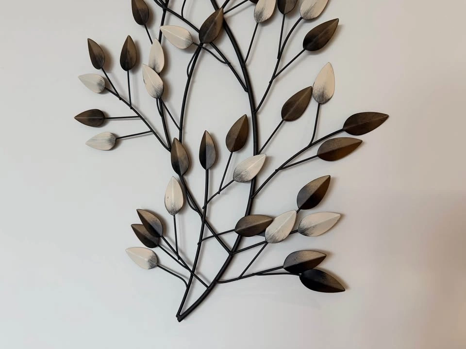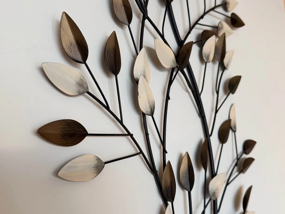 Decorative metal botanical wall art in excellent condition. Lightweight, easy to hang, and adds a modern organic touch to any space. The slight 3-D formation creates interest in light and colour and shadows on the piece depending on time of day and lighting in the room.