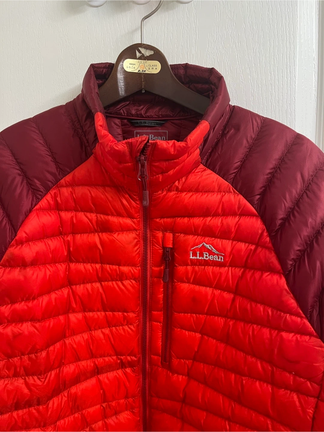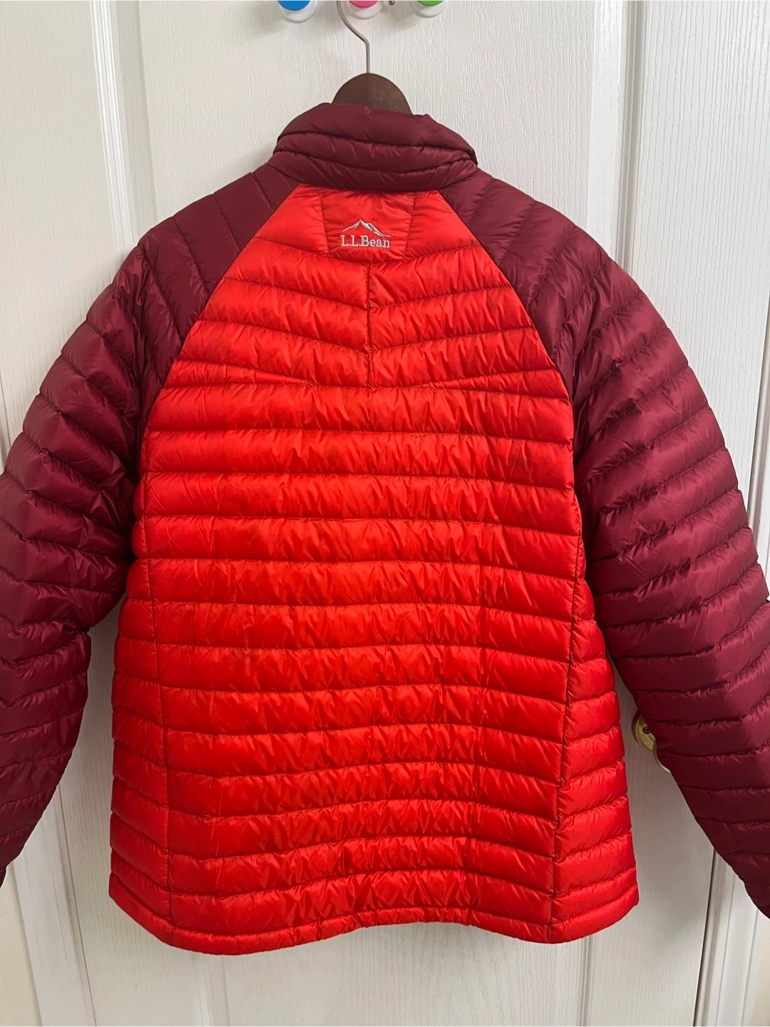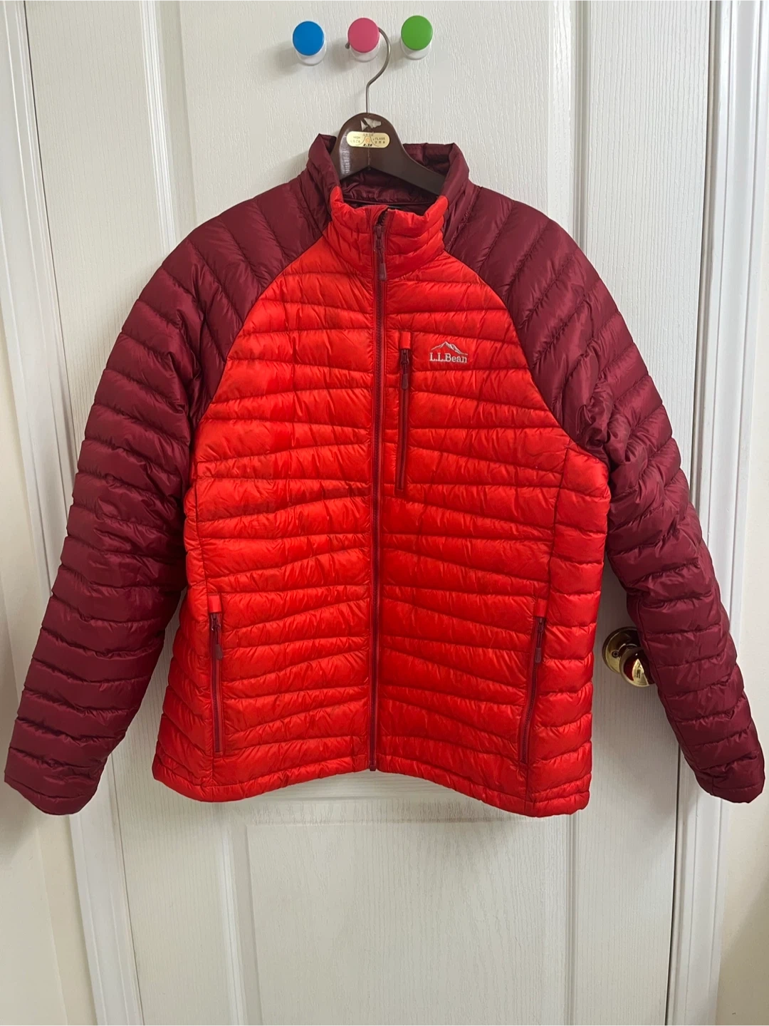 Selling a L.L.Bean Ultralight 850 Down Jacket in size L. It's a stylish and warm jacket, perfect for the Canadian weather! The jacket features a red and burgundy colour scheme. It is made in Bangladesh.