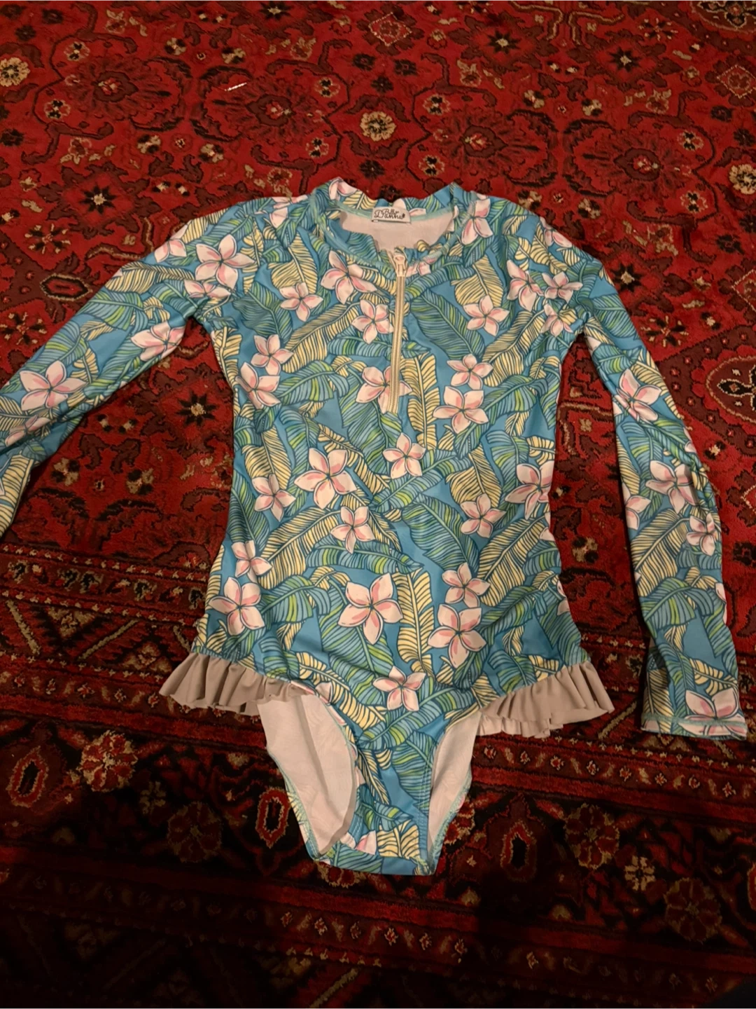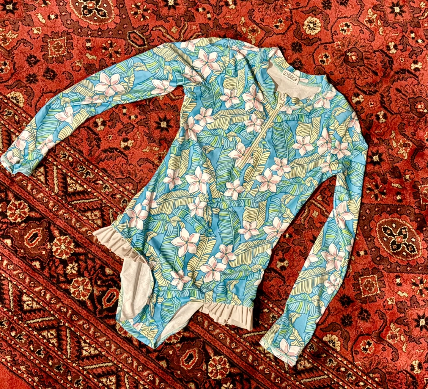 This adorable Snapper Rock long sleeve swimsuit is perfect for protecting your little one from the sun! It features a fun floral pattern and a comfortable fit. Size 2.