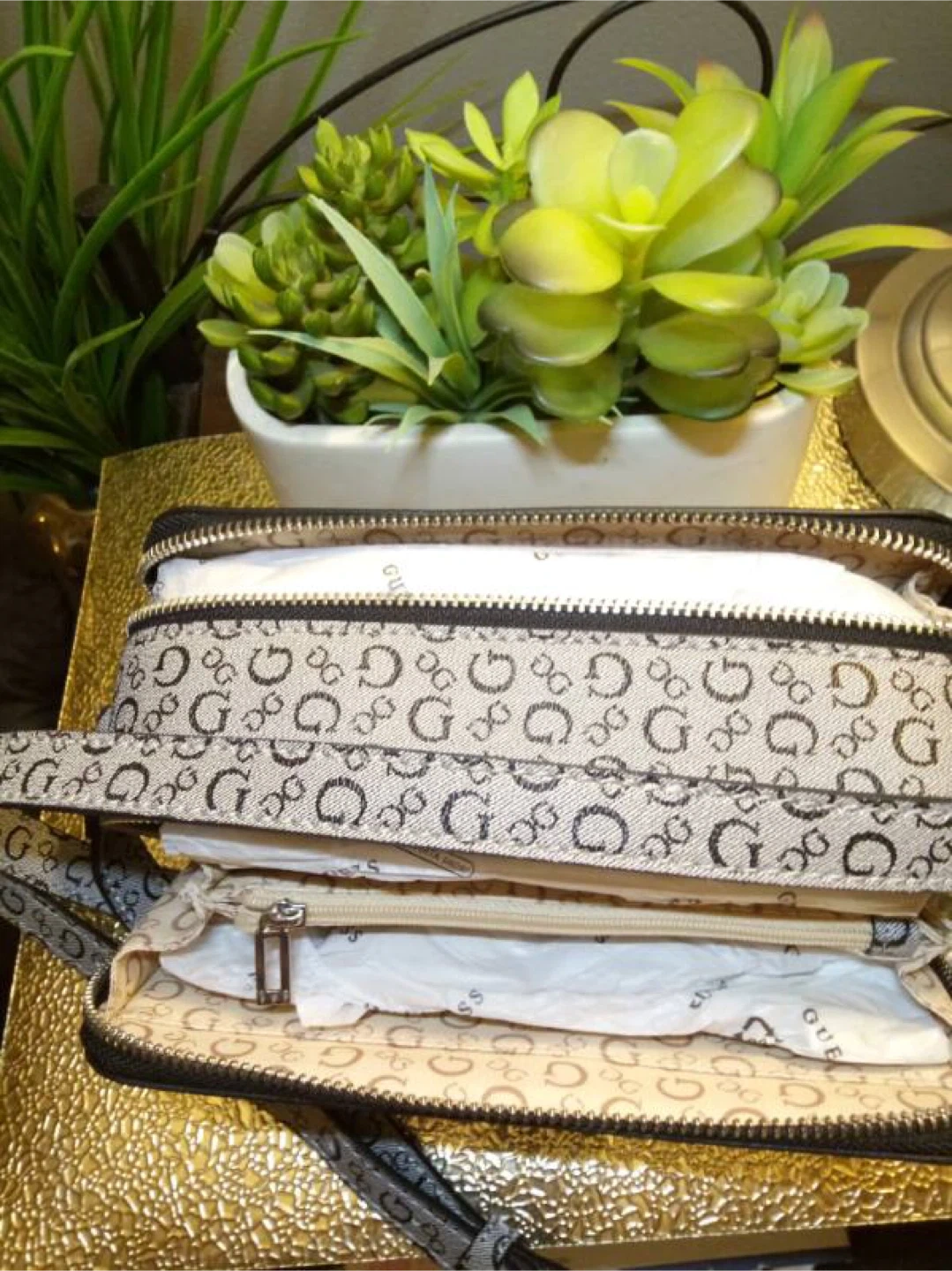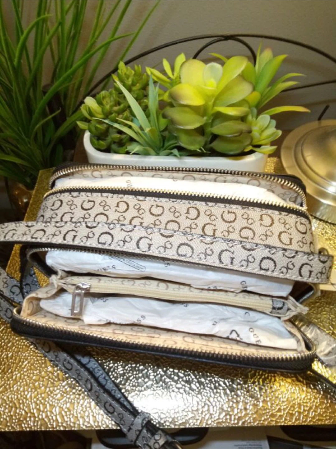 This is a new Guess crossbody bag. It has a gray color with the Guess logo all over the bag and strap. It has multiple zippered compartments.