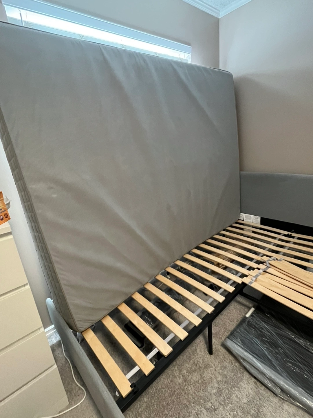 Selling a gray bed frame that's in good condition. It comes with all the slats needed for support. The frame is a stylish gray color, perfect for any bedroom. Get a great deal on this sturdy bed frame!