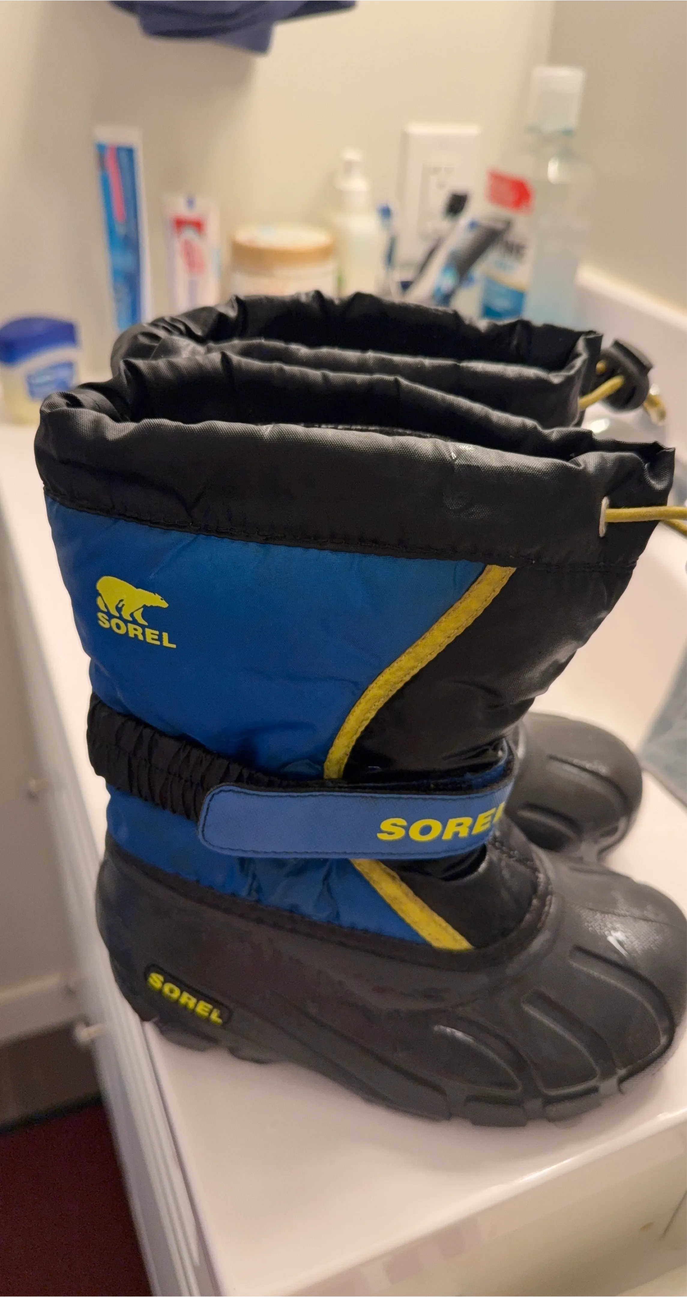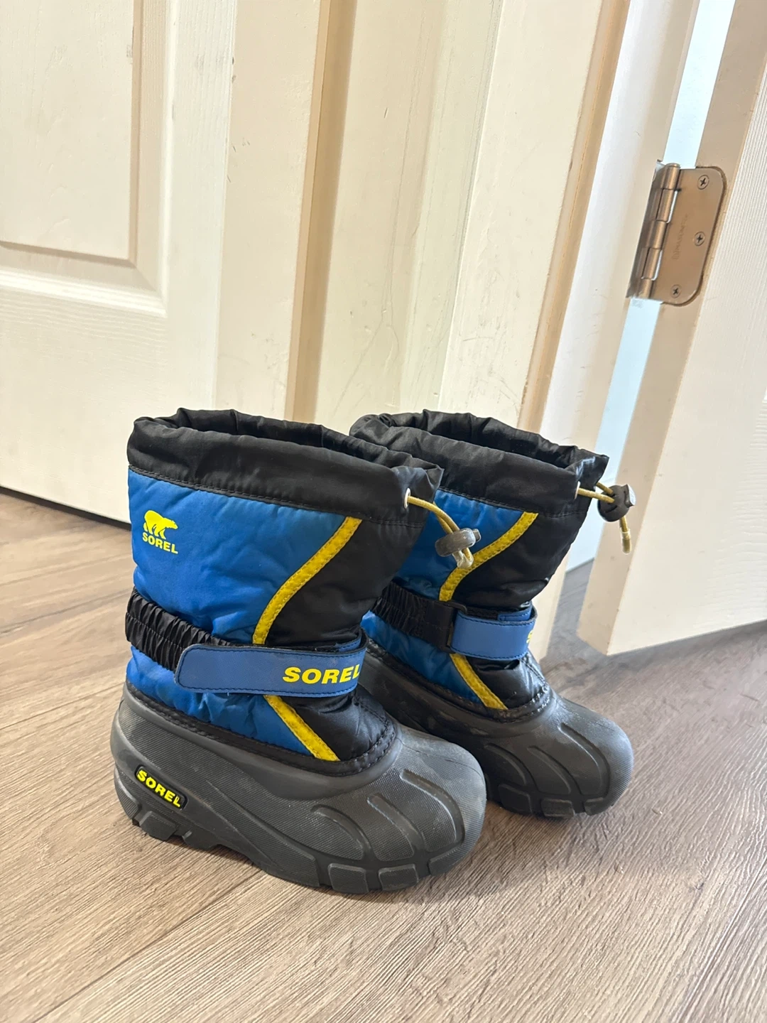 These Sorel Kids Snow Commander boots are perfect for keeping little feet warm and dry this winter! They feature a blue and black design with the Sorel logo. Great for snowy adventures!