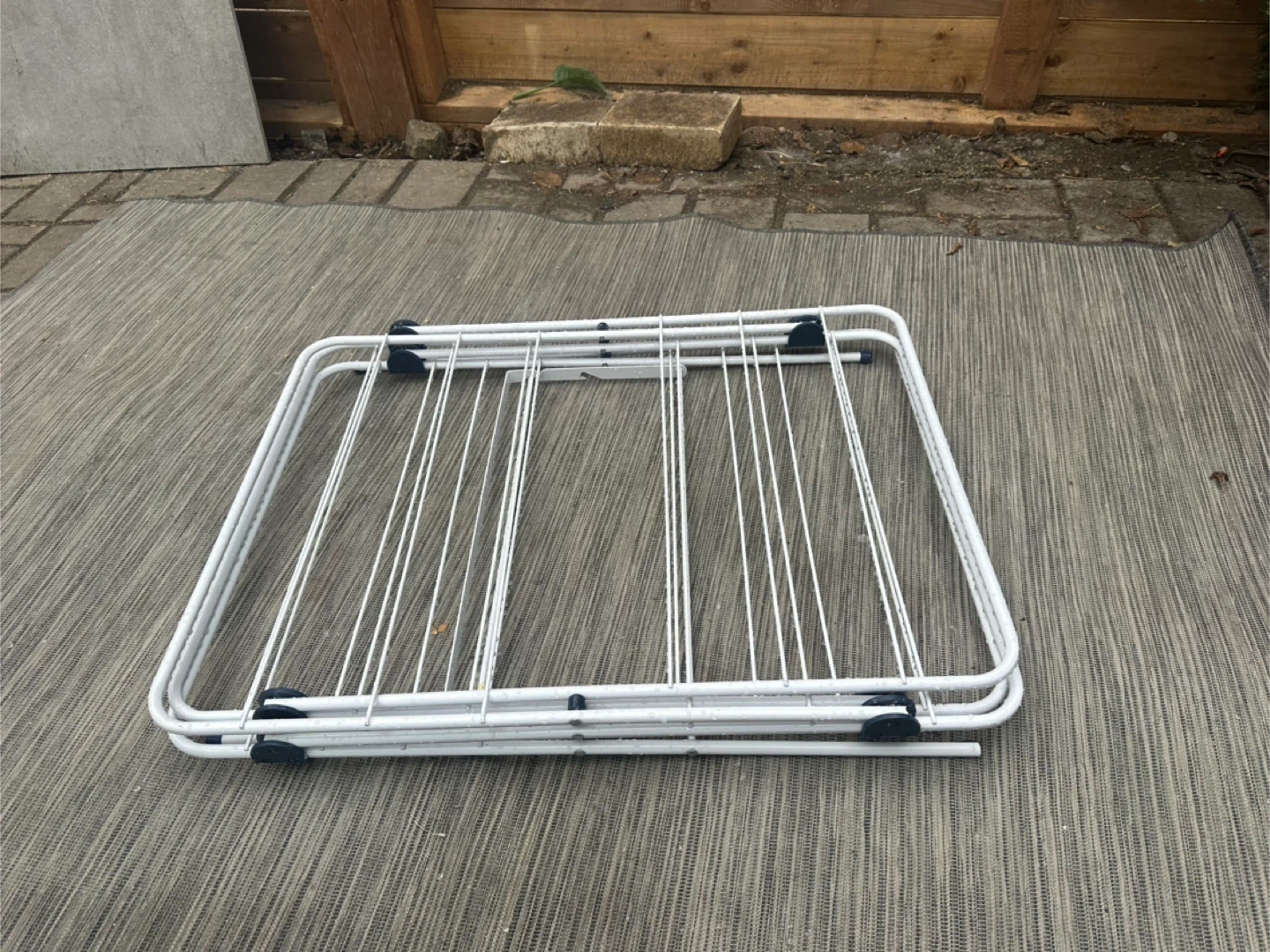 Selling a white folding clothes drying rack! It's in great shape and perfect for saving space when you're not using it. Folds up easily for storage, too!