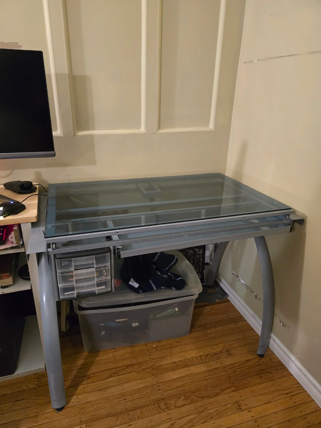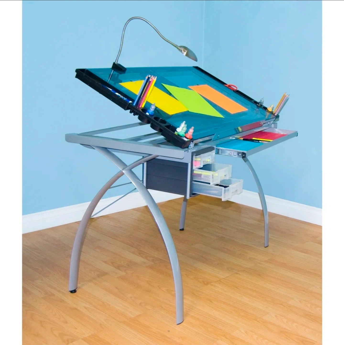 Studio Designs Craft Table. Regular price $469 without tax. The desk is tiltable meaning you don't have to hunch your bag when drawing. It's in one piece with the exception that the pencil holders on the side are missing and the glass needs to superglued.