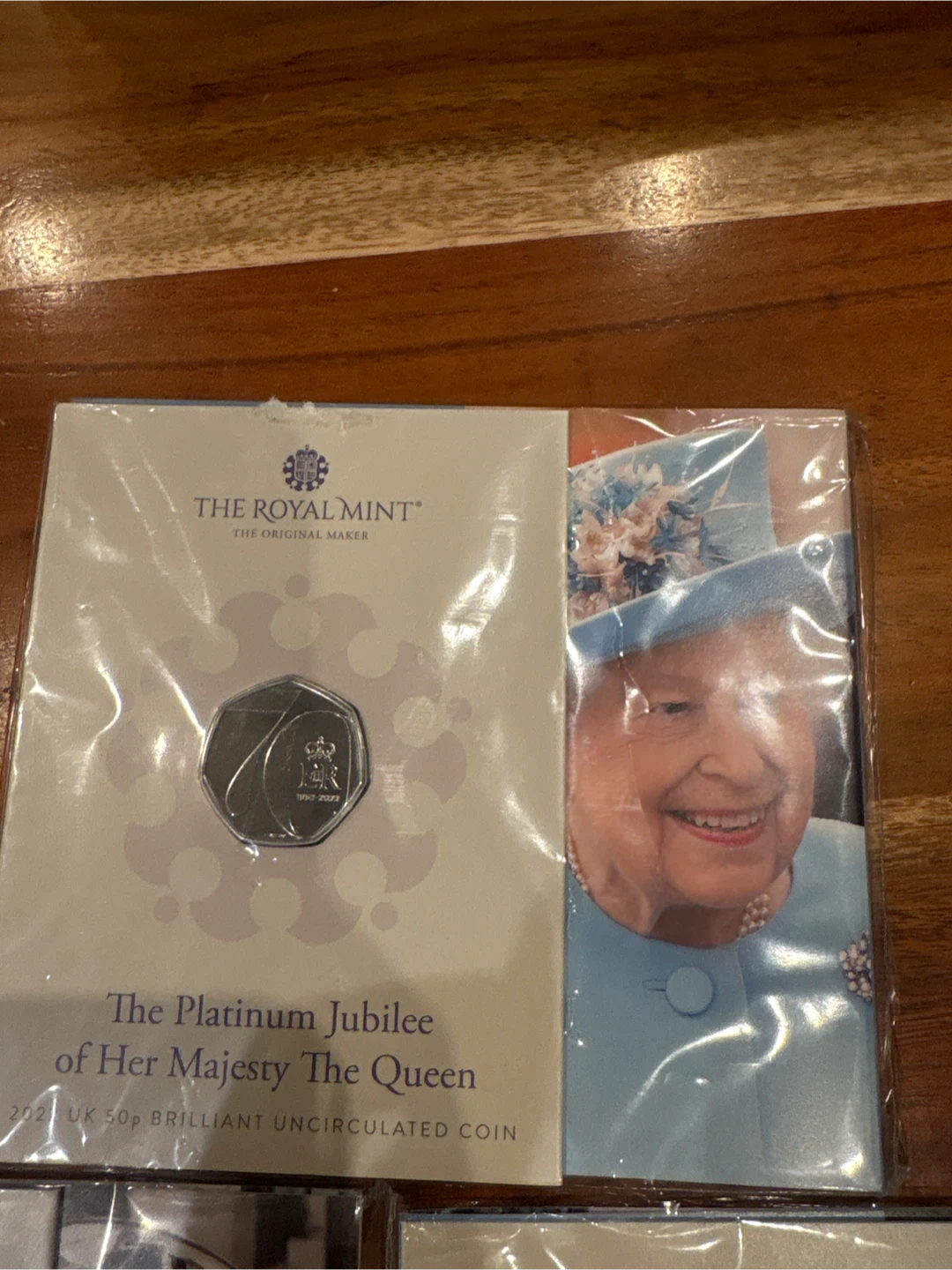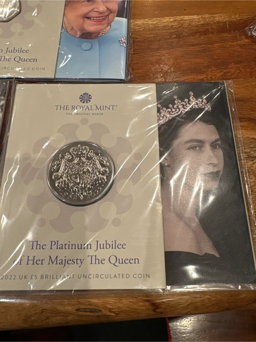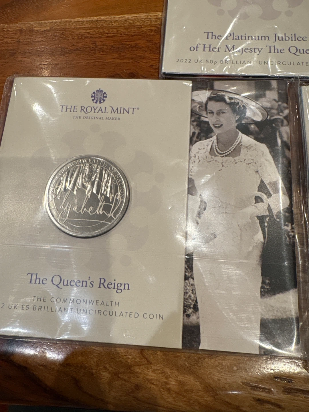 Selling a collection of Royal Mint coins, including The Platinum Jubilee of Her Majesty The Queen (2022 UK 50p and £5 Brilliant Uncirculated Coins) and The Queen's Reign (£5 Brilliant Uncirculated Coin). They are still sealed in their original packaging!