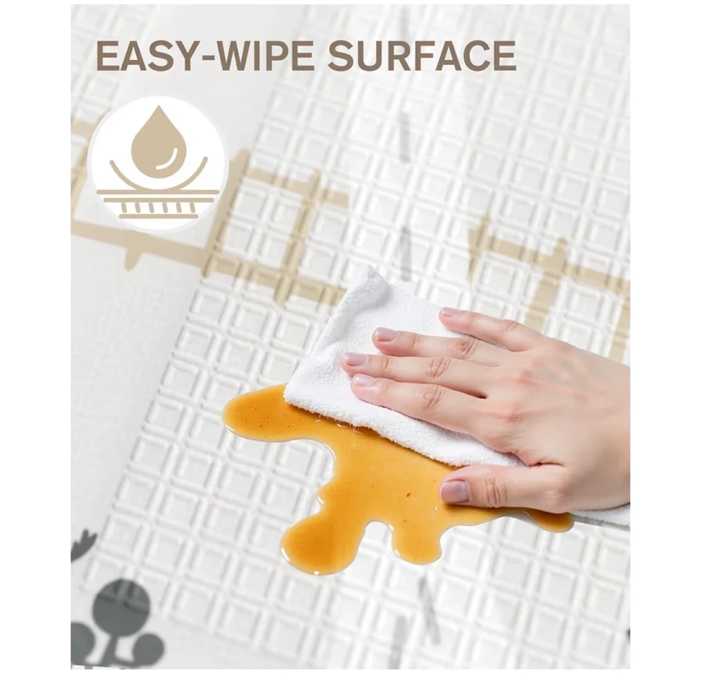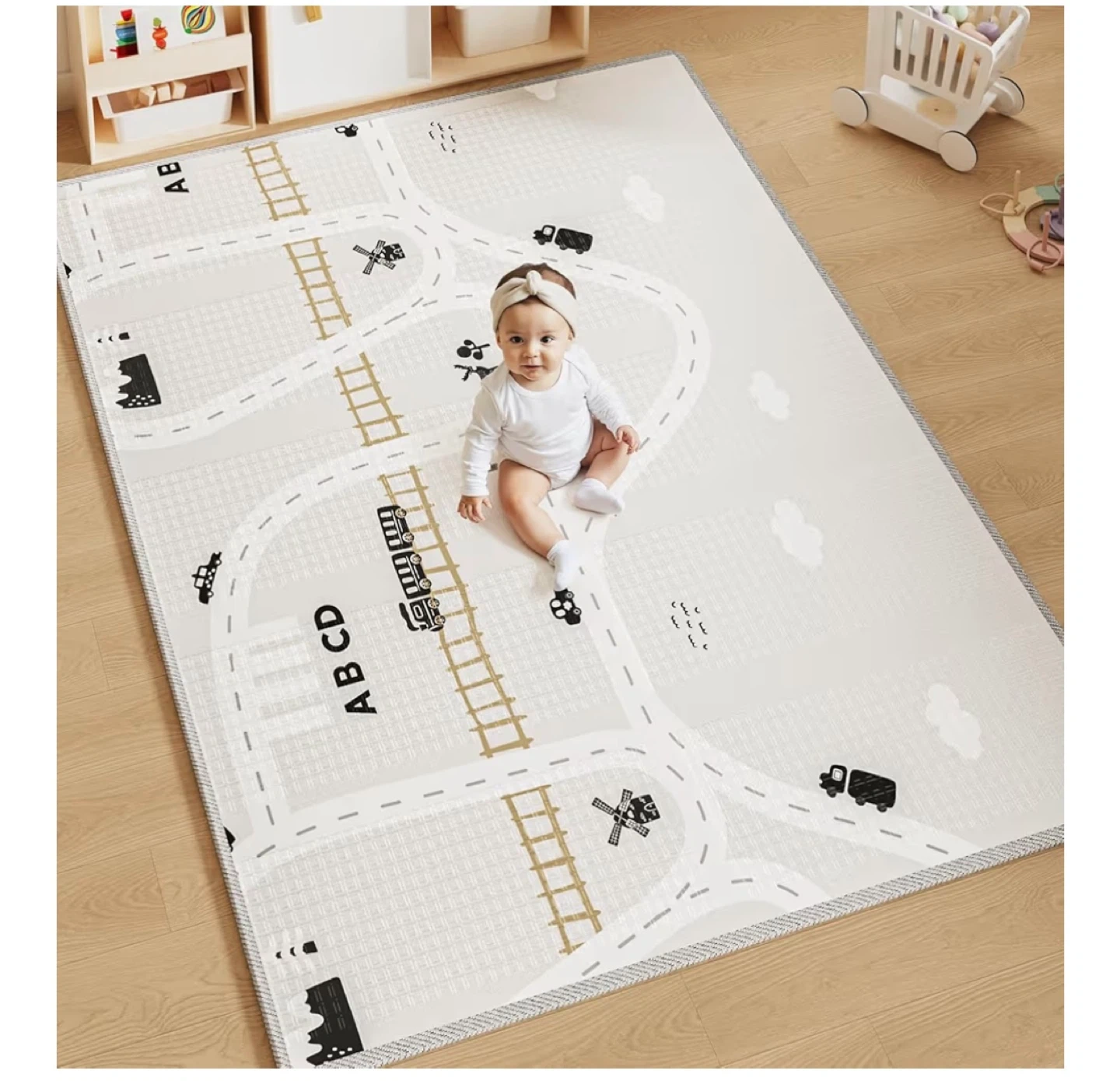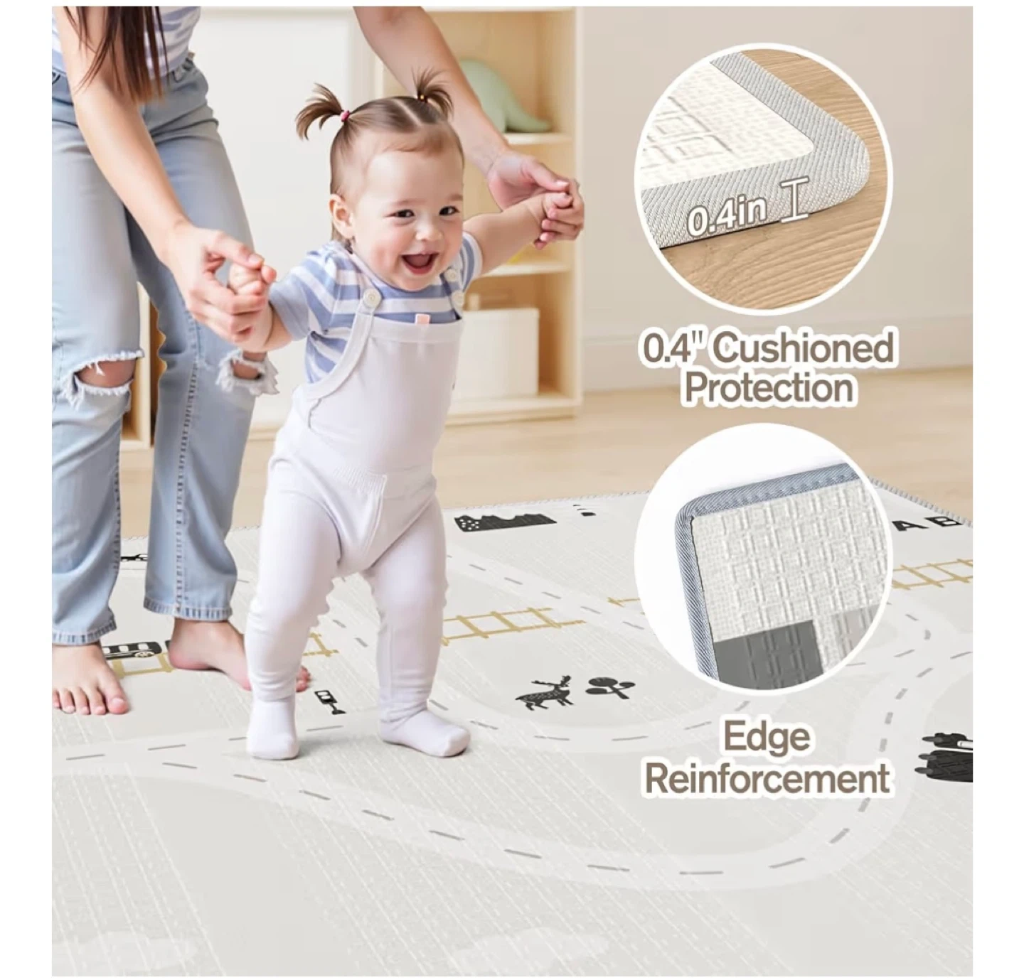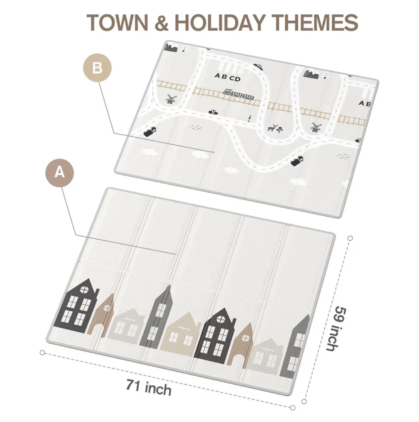 This play mat features town and holiday themes, perfect for playtime! It measures 71 x 59 inches and is easy to fold for storage. It also has 0.4" cushioned protection and edge reinforcement