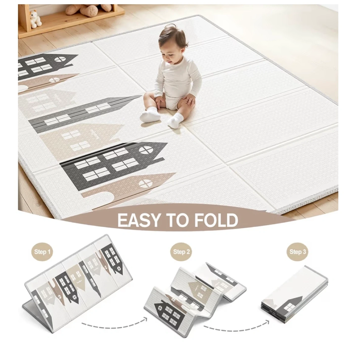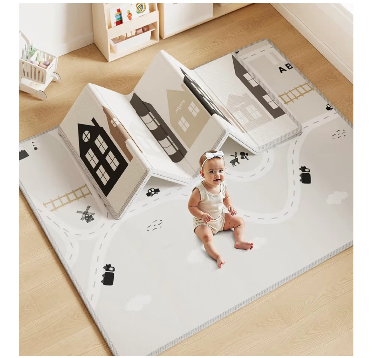 This play mat features town and holiday themes, perfect for playtime! It measures 71 x 59 inches and is easy to fold for storage. It also has 0.4" cushioned protection and edge reinforcement