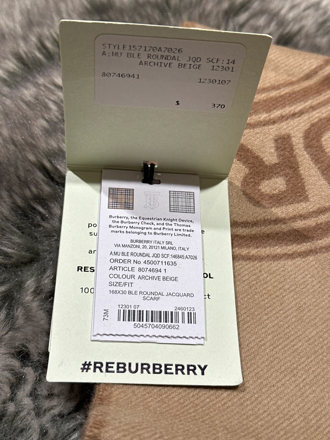 Selling a Burberry scarf in Archive Beige. It's a beautiful jacquard scarf. It's made in Italy from 100% wool. 168x30cm/66.14x11.81”