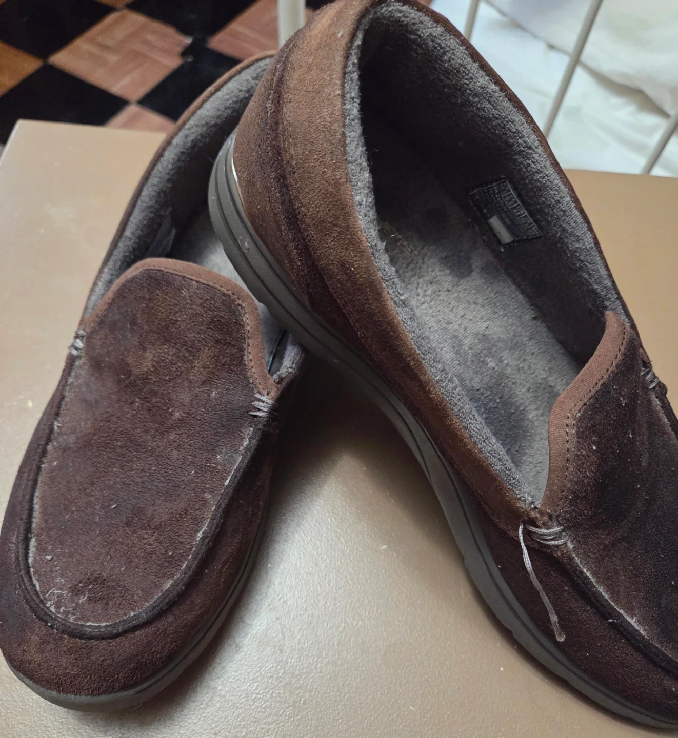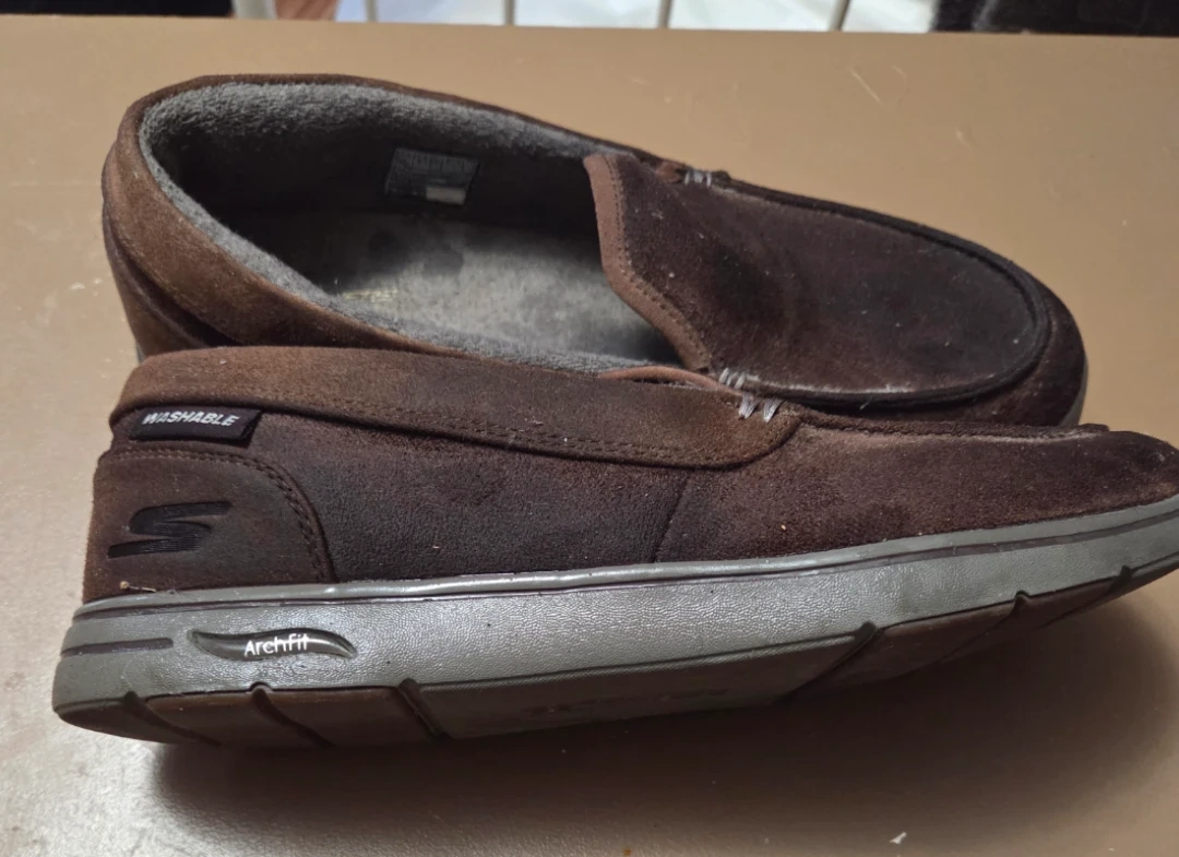 Selling a pair of Skechers Arch Fit men's loafers in a brown suede material. They're super comfy and have a washable design, making them easy to care for! The Arch Fit provides great support for all-day wear