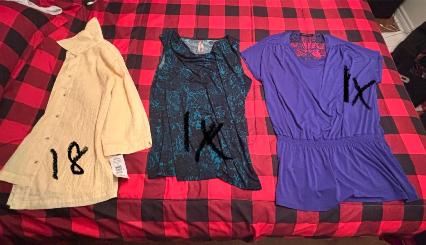 Selling a bundle of women's clothing! Includes a yellow blouse (size 18), a blue and black patterned top (size 1X), and a purple topsize 1X). All in good condition and ready for a new home!