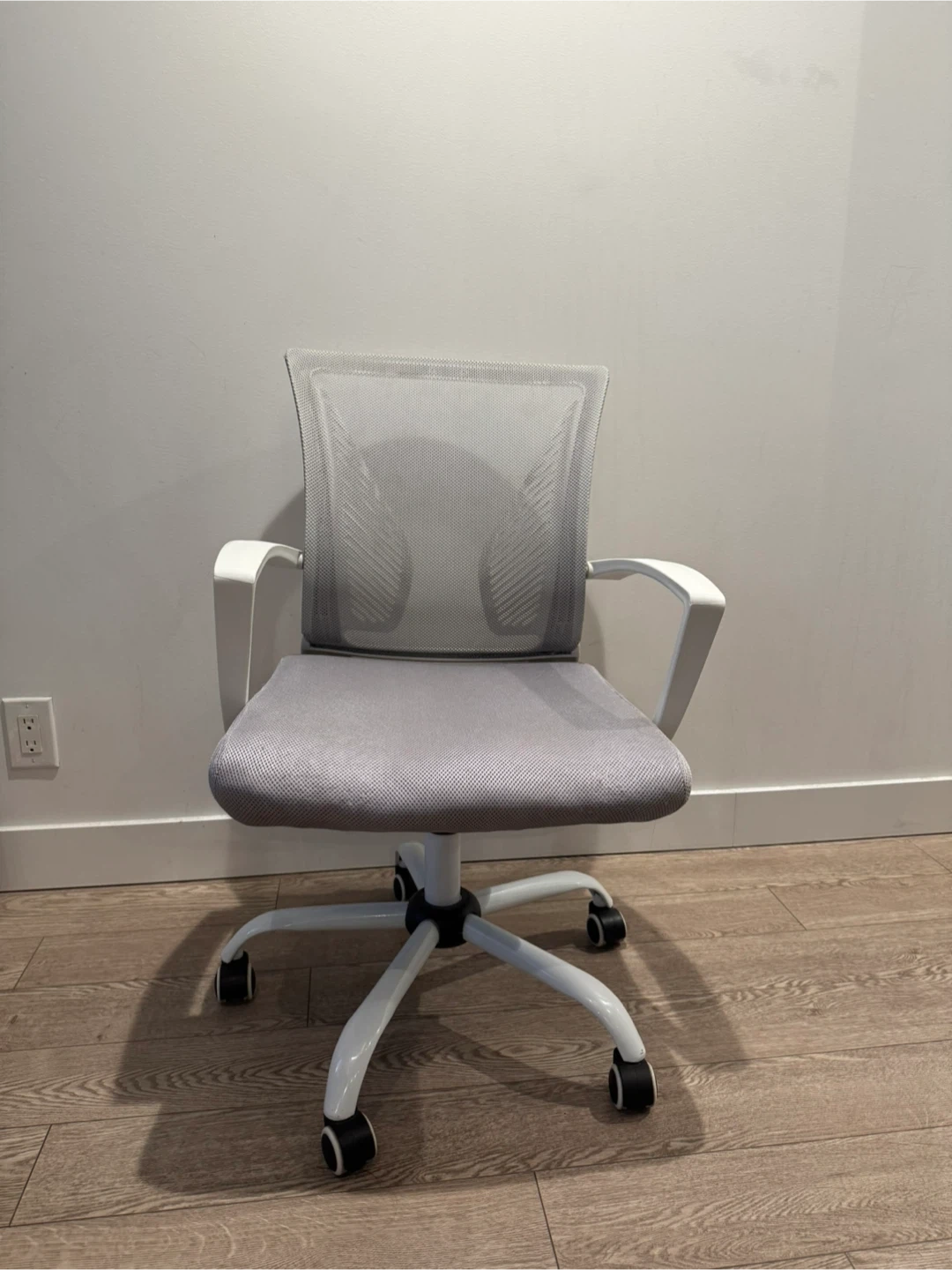 Selling a grey mesh office chair in great condition. It's perfect for a home office or study space. The mesh back provides good support and breathability, and the wheels make it easy to move around. It's a comfortable and functional chair!
