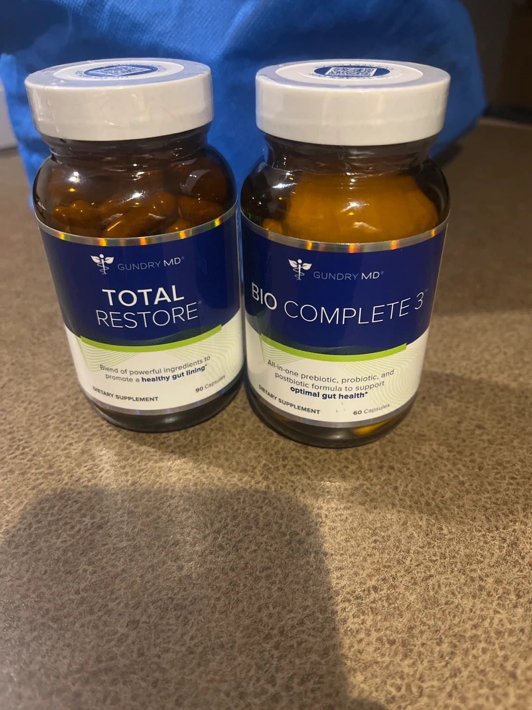 Selling two bottles of Gundry MD supplements. One is Total Restore (90 capsules) and the other is Bio Complete 3 (60 capsules). They are designed to support a healthy gut lining with a blend of powerful ingredients and all-in-one prebiotics, probiotics, and postbiotics