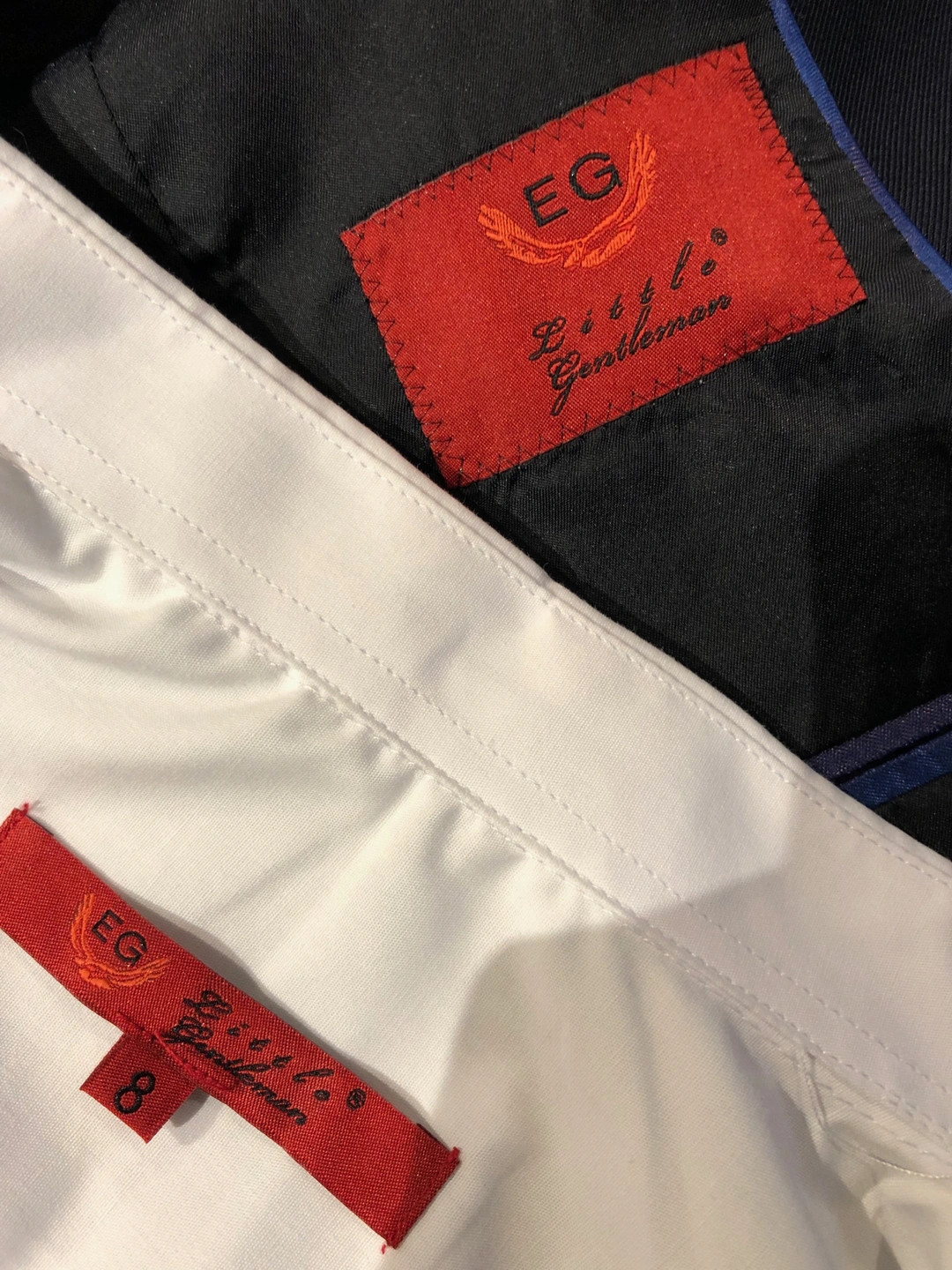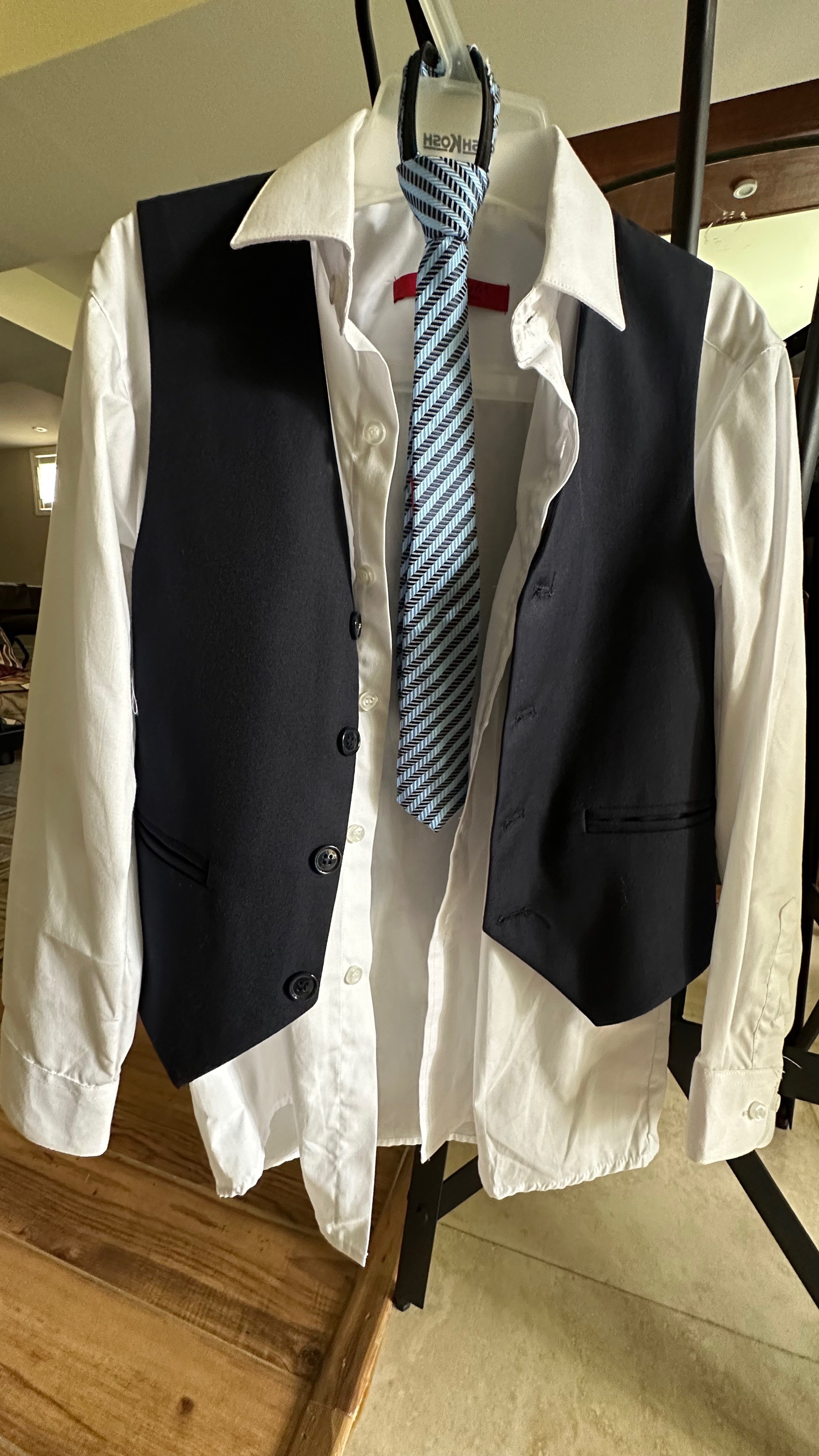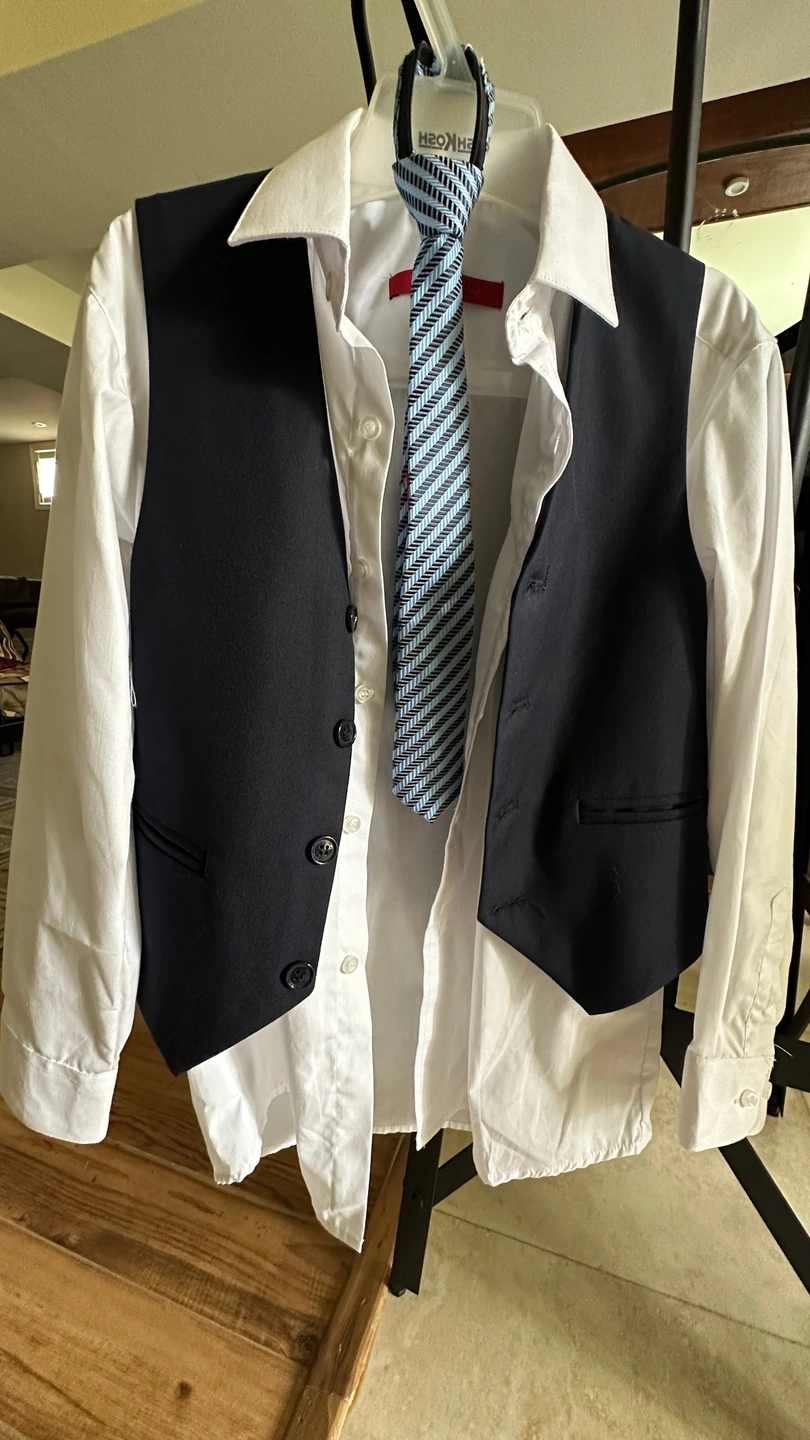 Selling a cute EG Little Gentleman suit, size 8. It includes a vest, dress shirt, and tie. Also included are a pair of St. Adams dress shoes, size 2M (US).