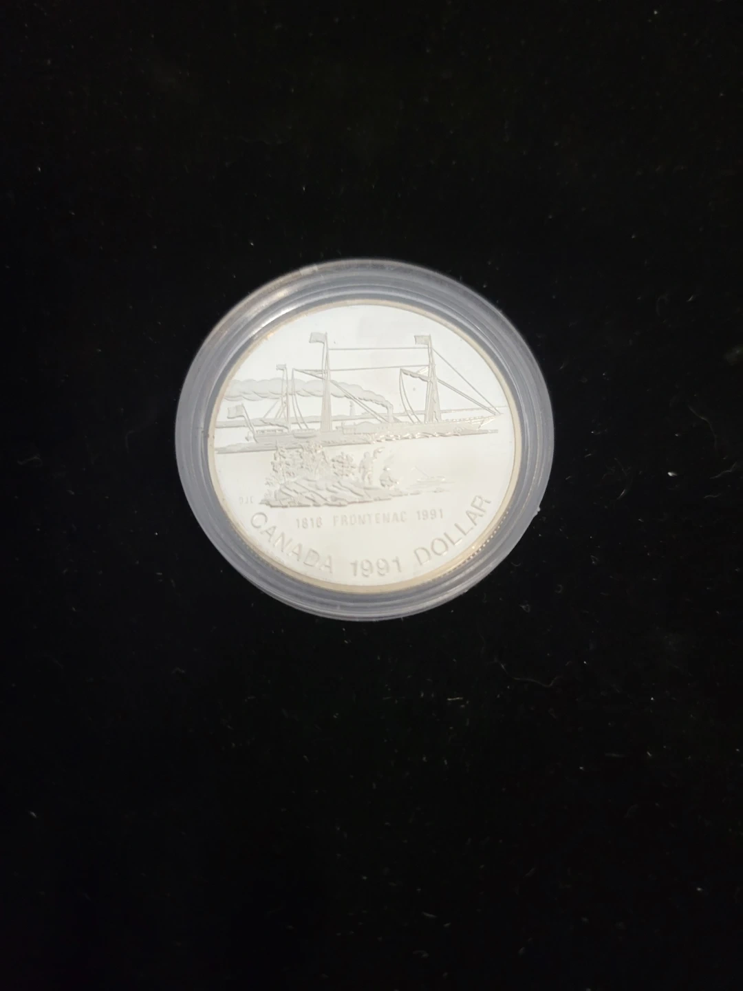 Selling a 1816 Frontenac 1991 Canada Dollar coin. It features a sailing ship on one side and Queen Elizabeth II on the other. A nice piece for collectors