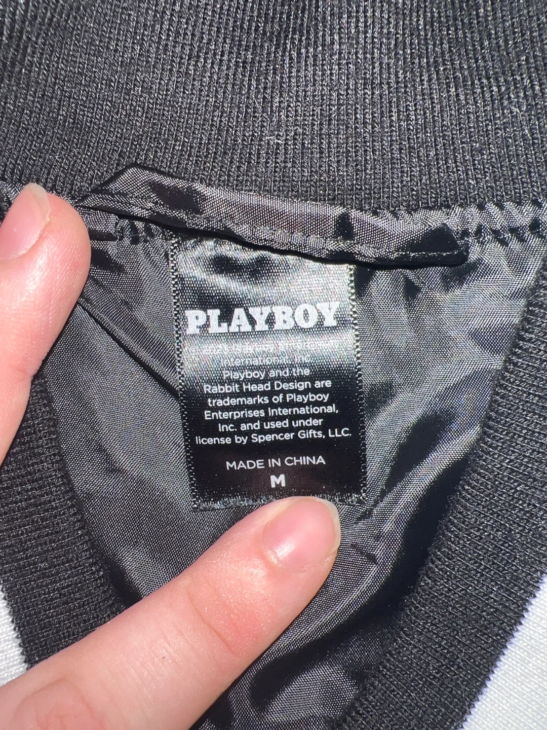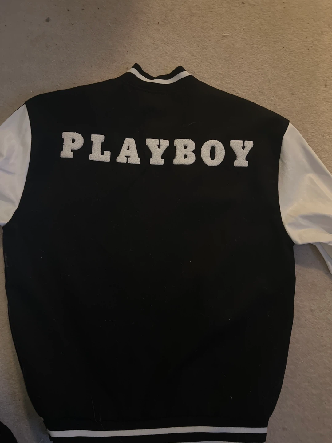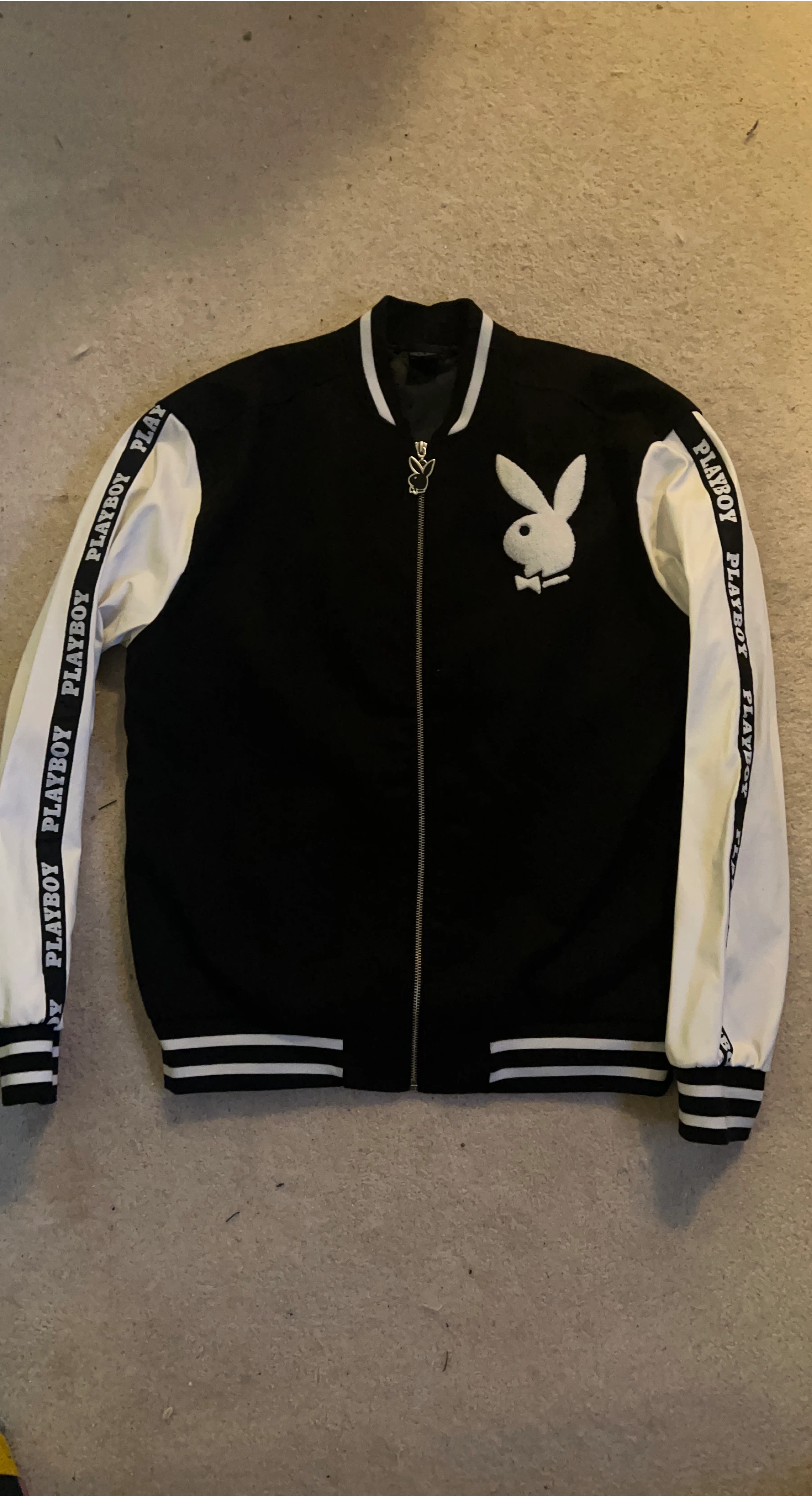 Selling a Playboy varsity jacket in size medium. It's black with white sleeves and the iconic Playboy bunny logo on the front. The brand name 'Playboy' is also written down the sleeves and across the back. Great for adding a bit of retro flair to your wardrobe!