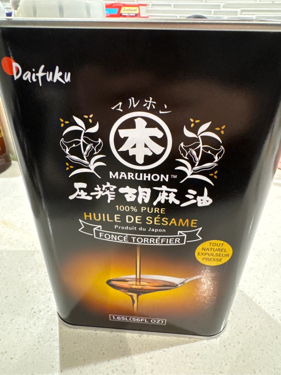 Selling a can of Maruhon 100% Pure Sesame Oil. It's in a 1.65L (56 fl oz) can and is a product of Japan. It's described as 'Foncé Torréfier' and 'Tout Naturel Expulseur Pressé'.