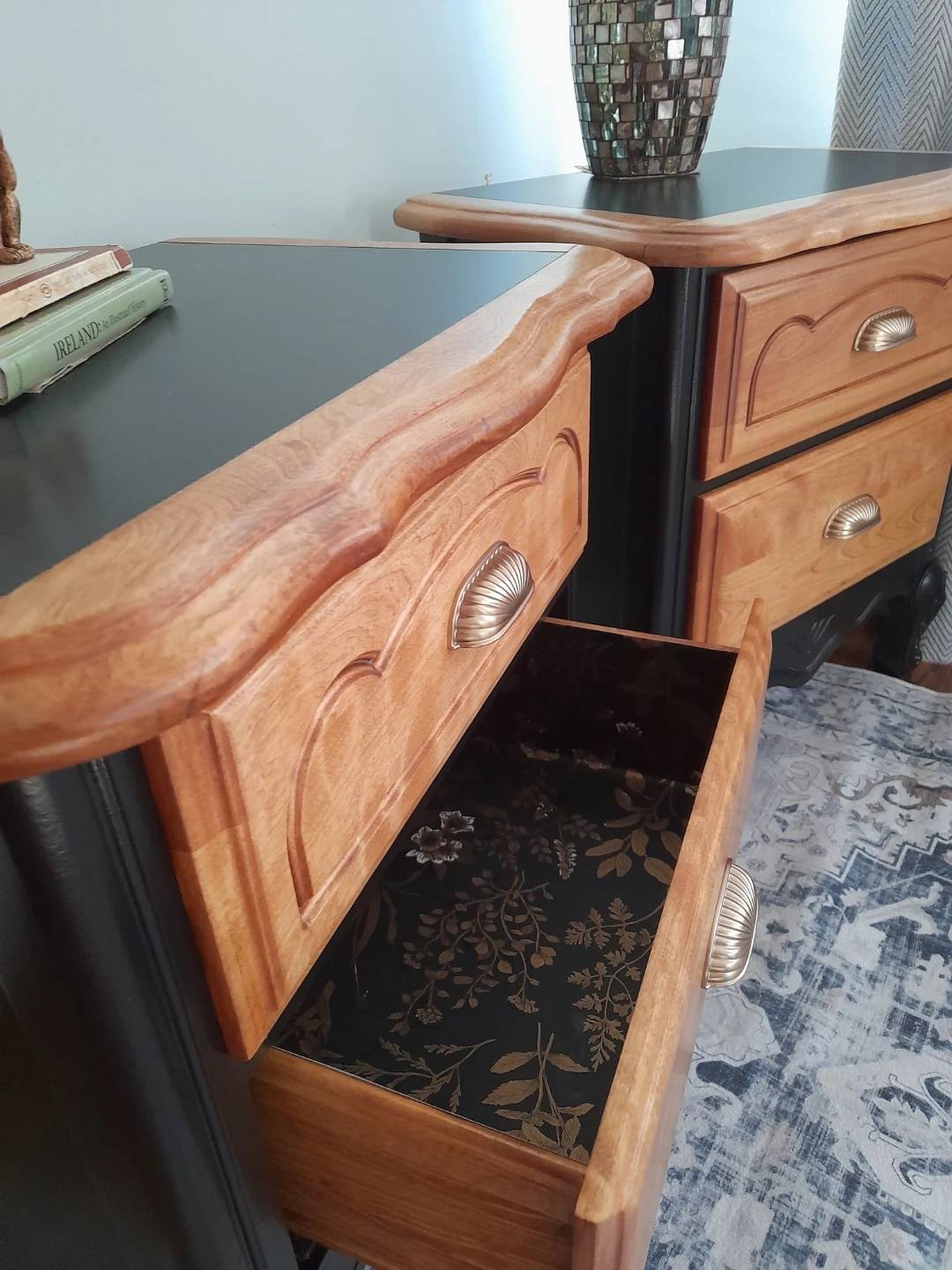 MADE IN CANADA! Canadian made French provincial style night stands/side tables, restored to show natural wood stained with golden oak which contrasts the painted frame with black onyx blends sophistication with charm.