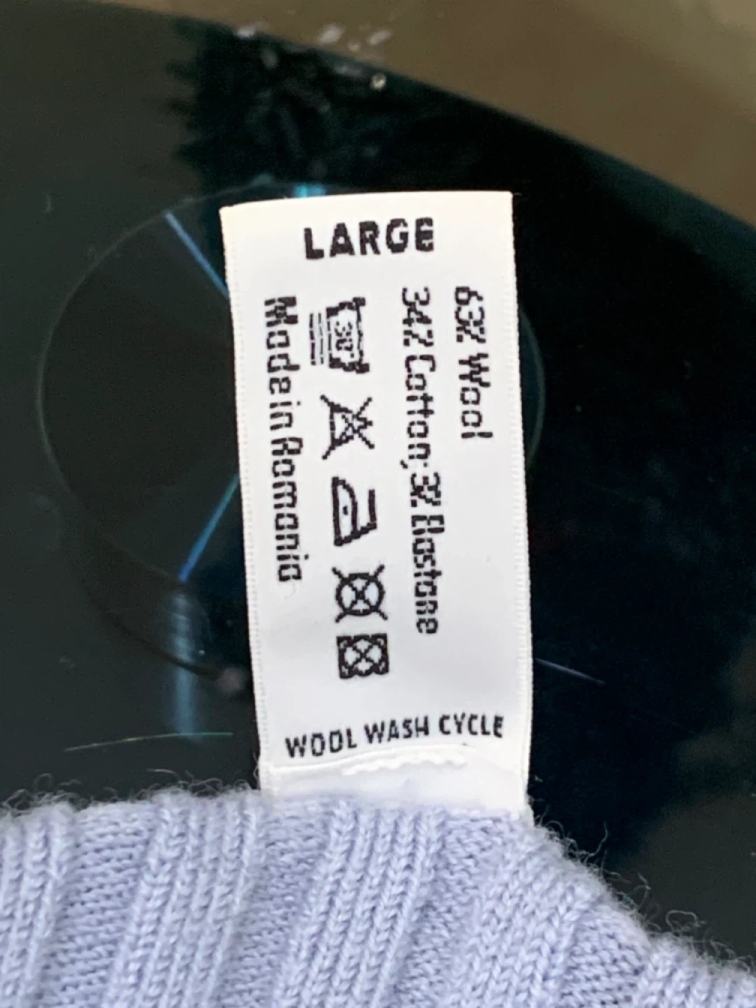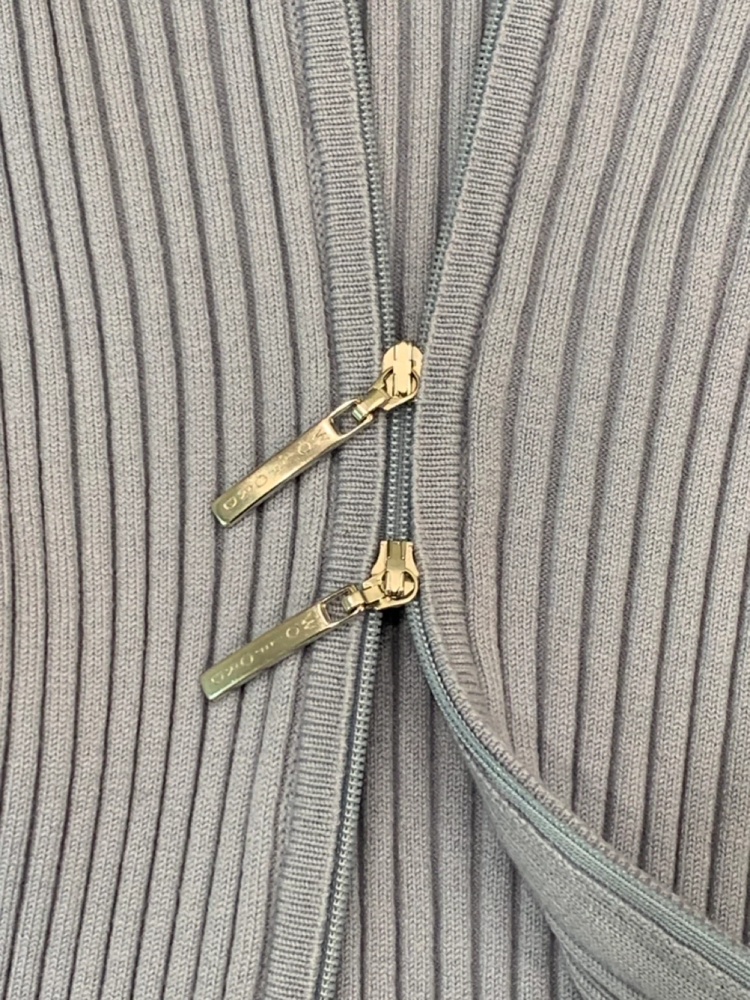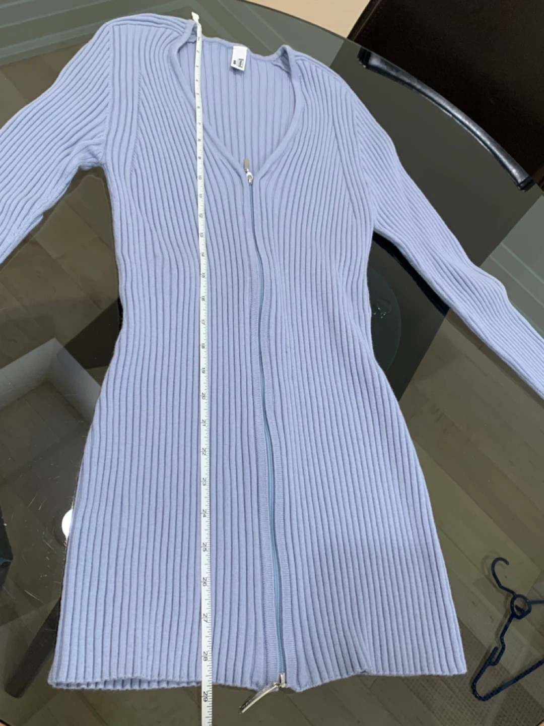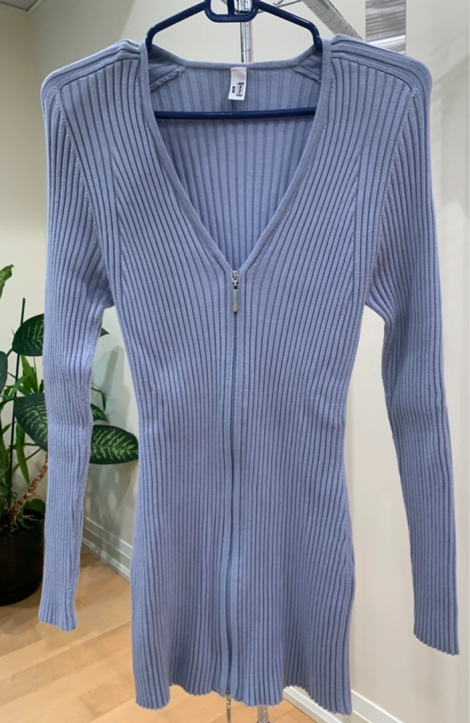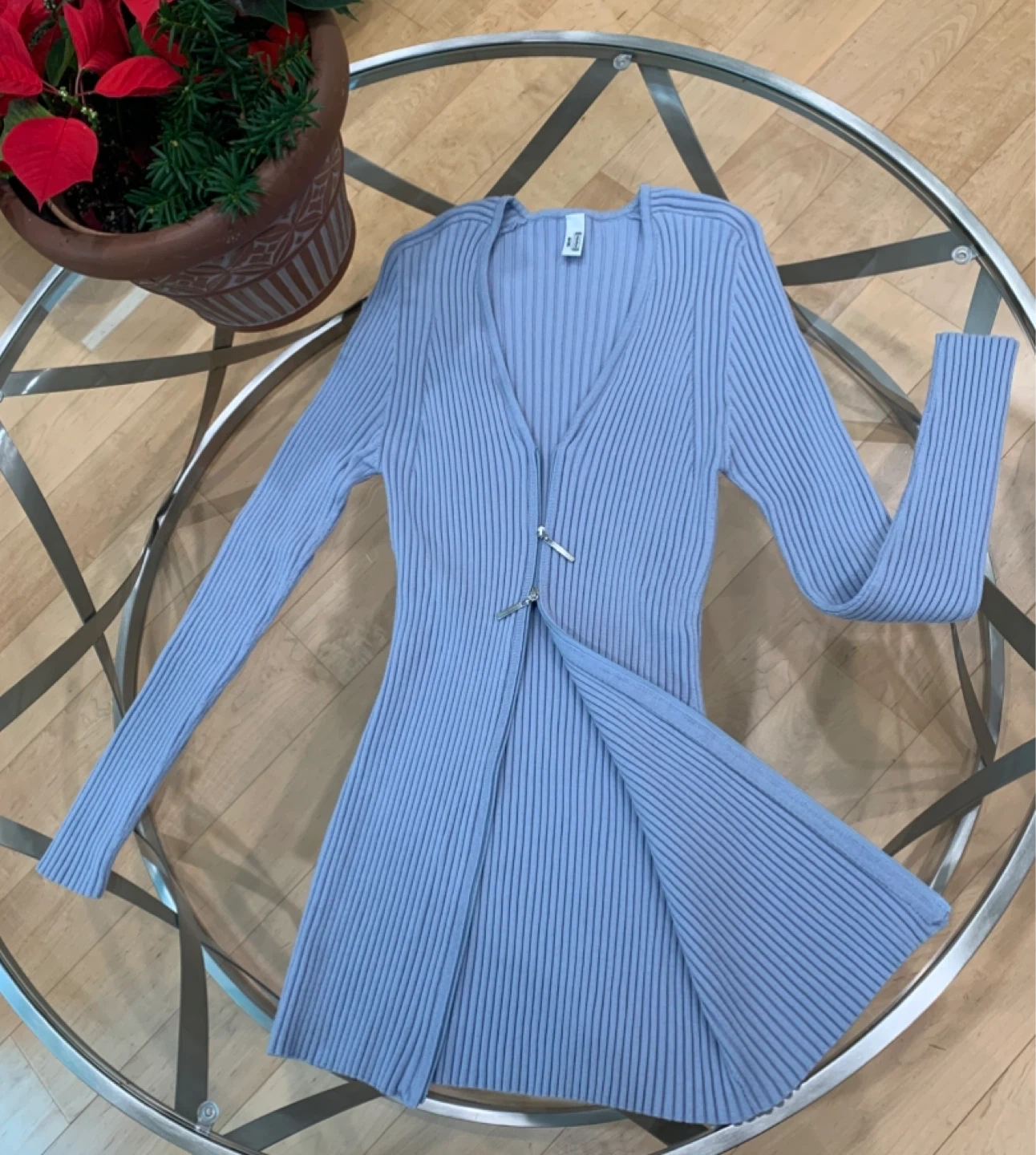 It’s a long 2-way zipper style that works as a cardigan or a fitted dress. The color is a gorgeous light periwinkle blue.