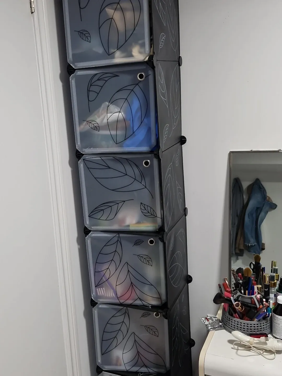 Selling a storage cube organizer in black with a cute leaf design on each cube. It's perfect for organizing your closet, bedroom, or any space that needs a little tidying up! Each cube provides ample space for clothes, accessories, or other items