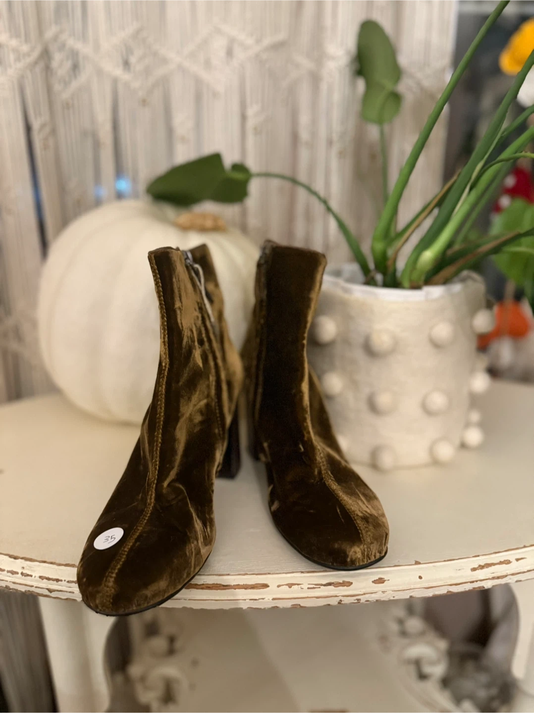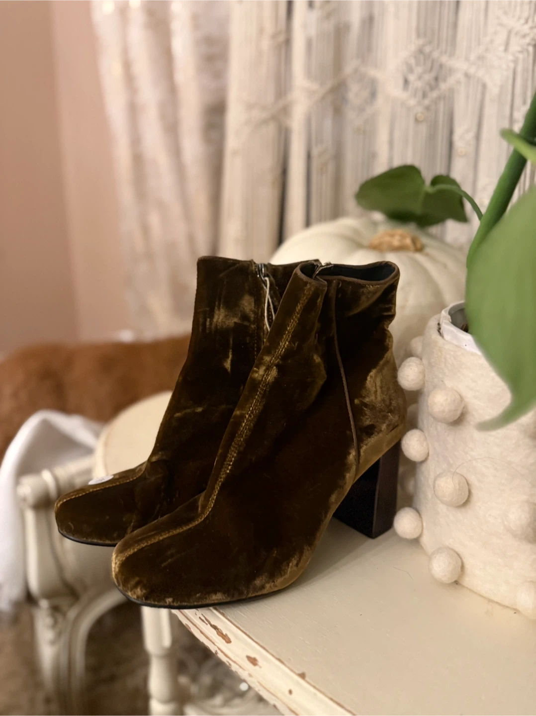 Selling a pair of Loeffler Randall velvet booties in a beautiful olive green colour. They are a size 36. Perfect for adding a touch of elegance to any outfit!