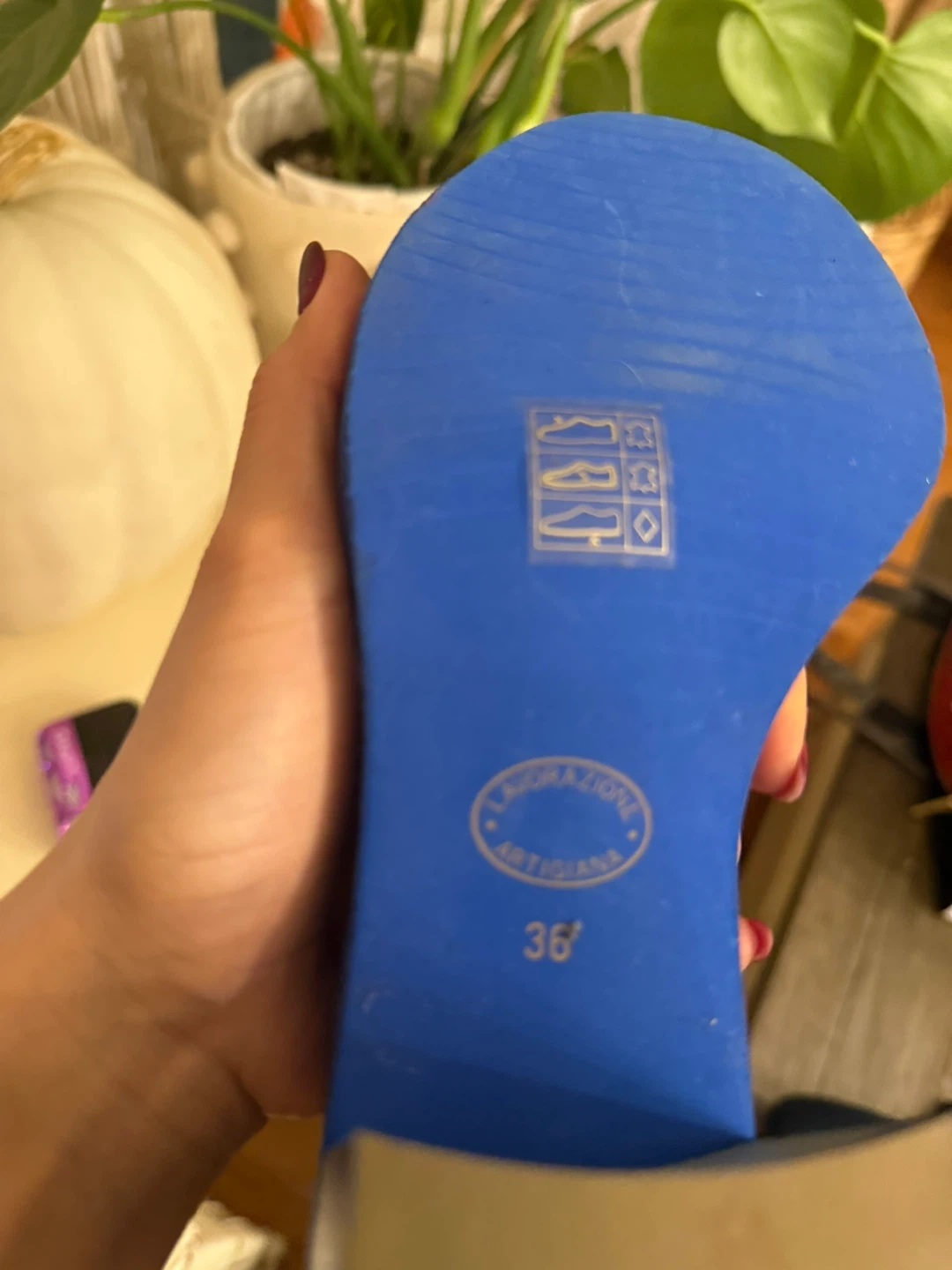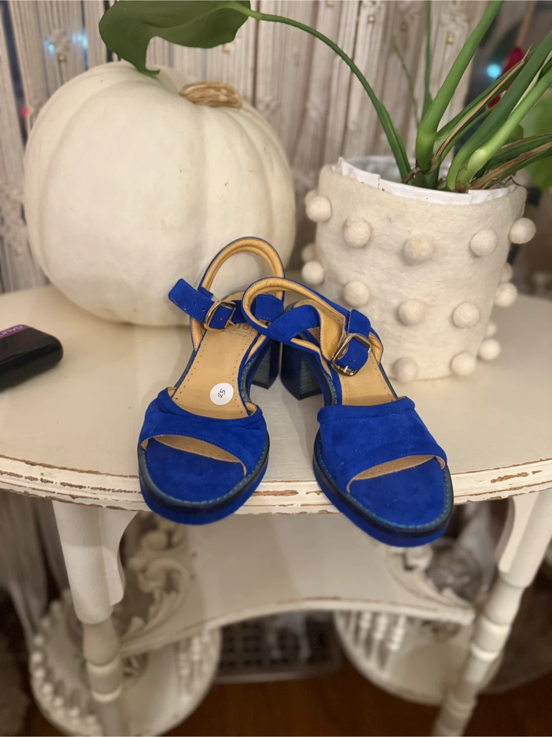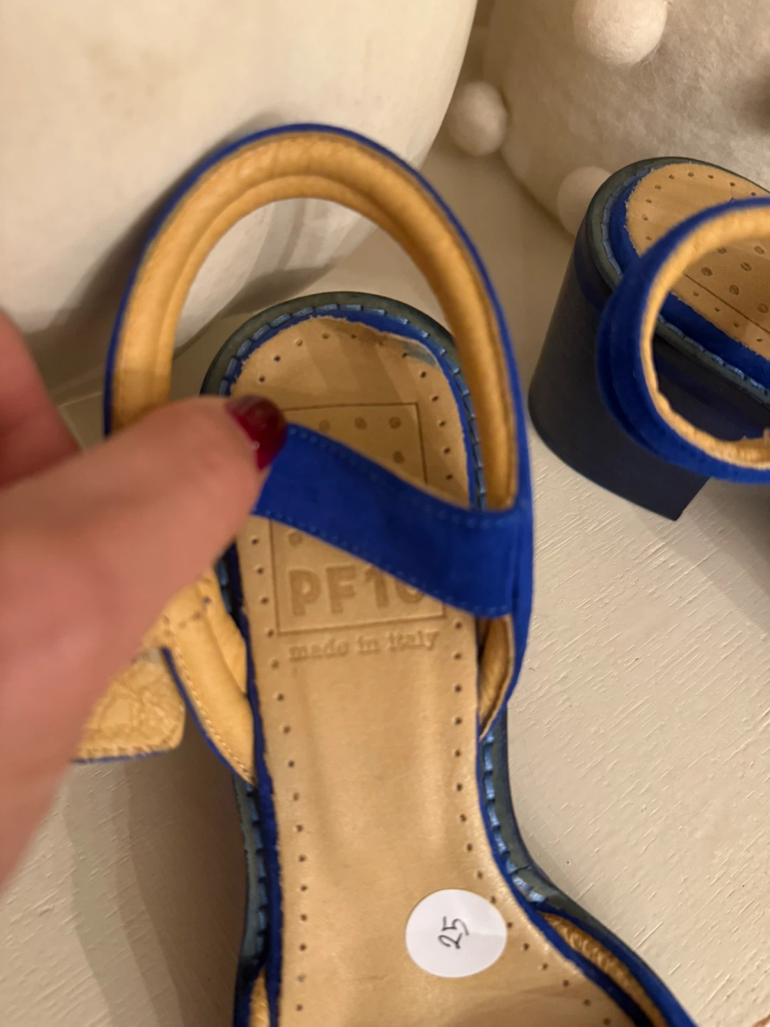 These are a cute pair of blue suede sandals from PF18. They are a size 36, which is approximately a size 6 in US/Canadian sizing. Made in Italy!