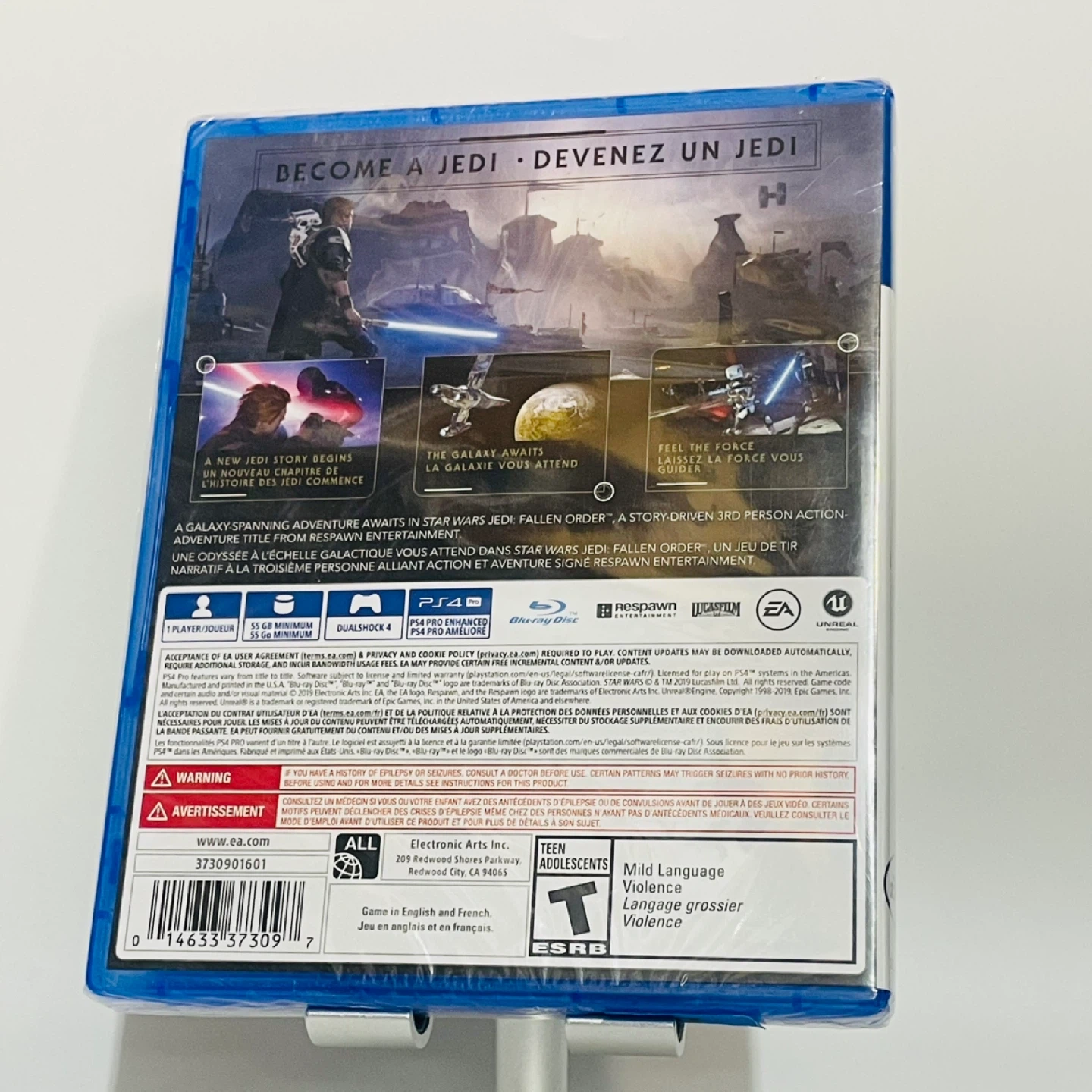 Selling a copy of Star Wars Jedi: Fallen Order for the PlayStation 4! It's a story-driven, 3rd person action-adventure title from Respawn Entertainment. Rated T for Teen, it includes mild language and violence.