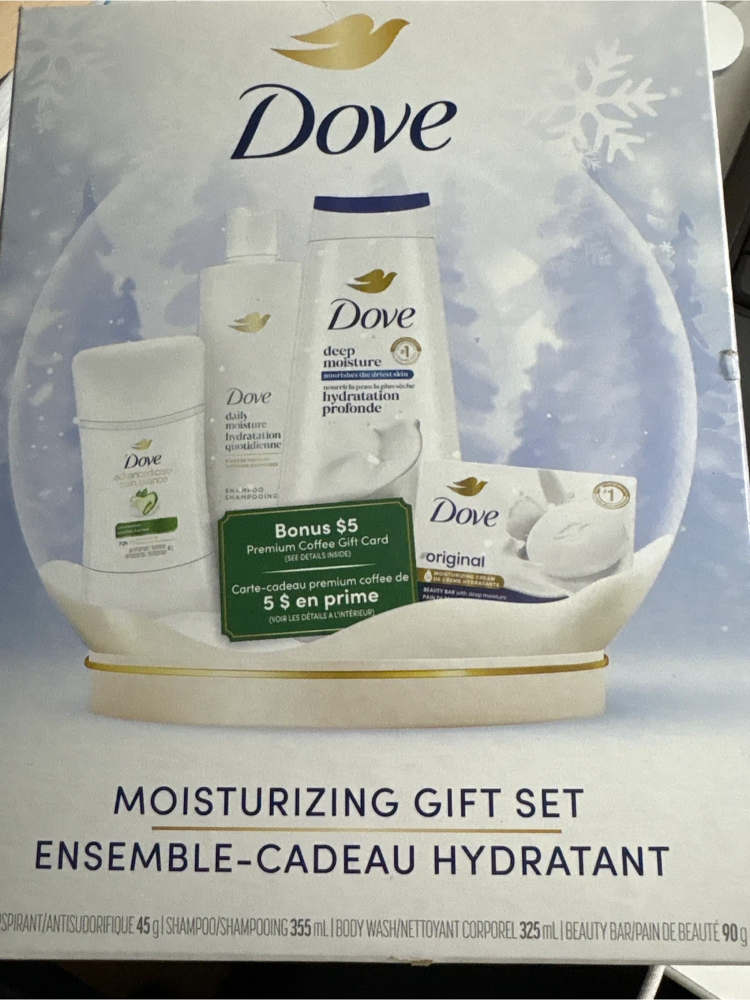 Selling a Dove Moisturizing Gift Set that includes a bonus $5 premium coffee gift card! This set is perfect for nourishing dry skin with deep moisture. It includes: