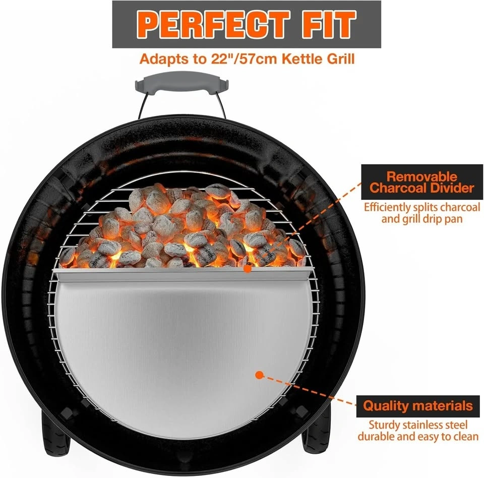 High-quality stainless steel drip pan & charcoal divider designed for Weber 22" kettle grills. Perfect for keeping your grill clean, controlling grease, and creating two cooking zones for low-and-slow BBQ. Also helps stabilize temperature and improves charcoal burn efficiency.