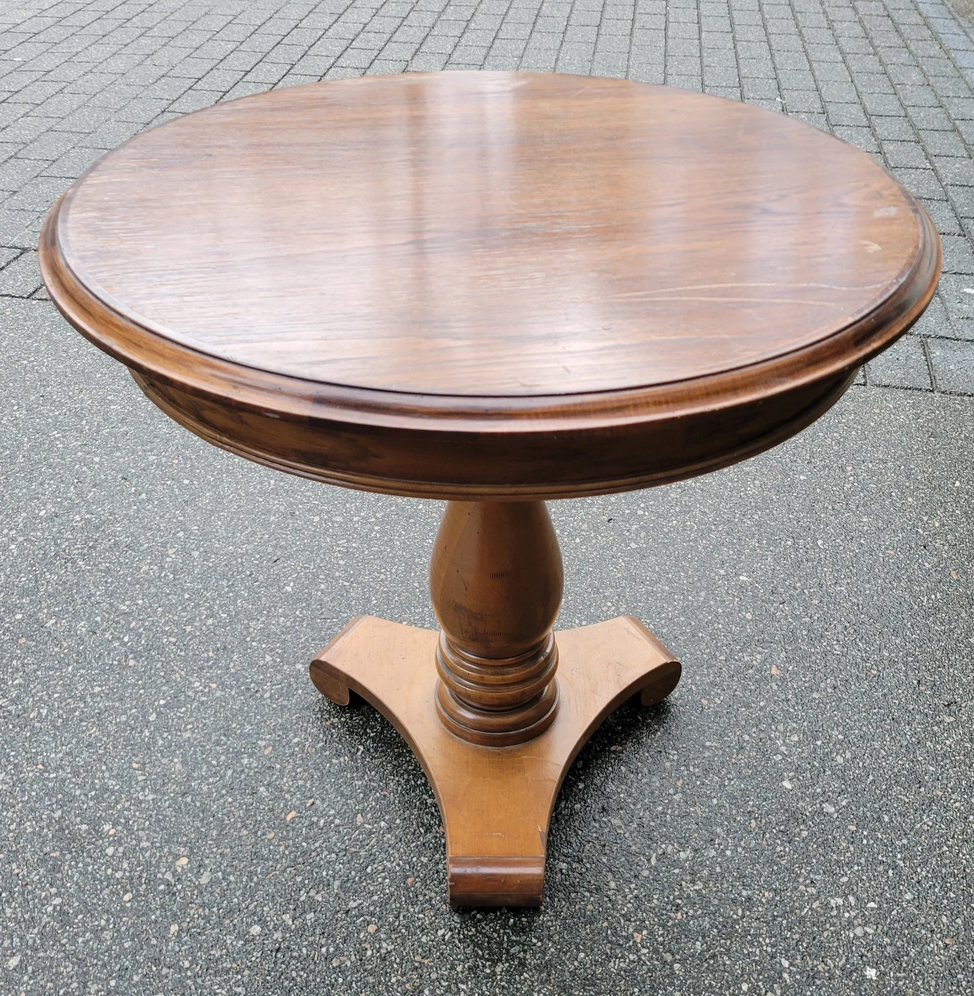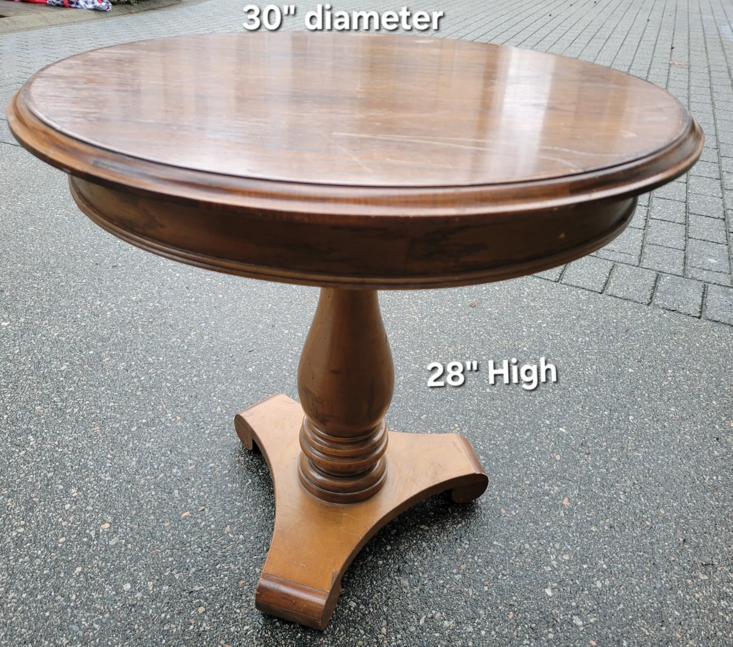 Here's a very nice round wooden table with a 30-inch diameter and stands 28 inches high. Perfect for a small dining area or as an accent piece! Delivery available if needed. Let me know if you are interested. Thanks.