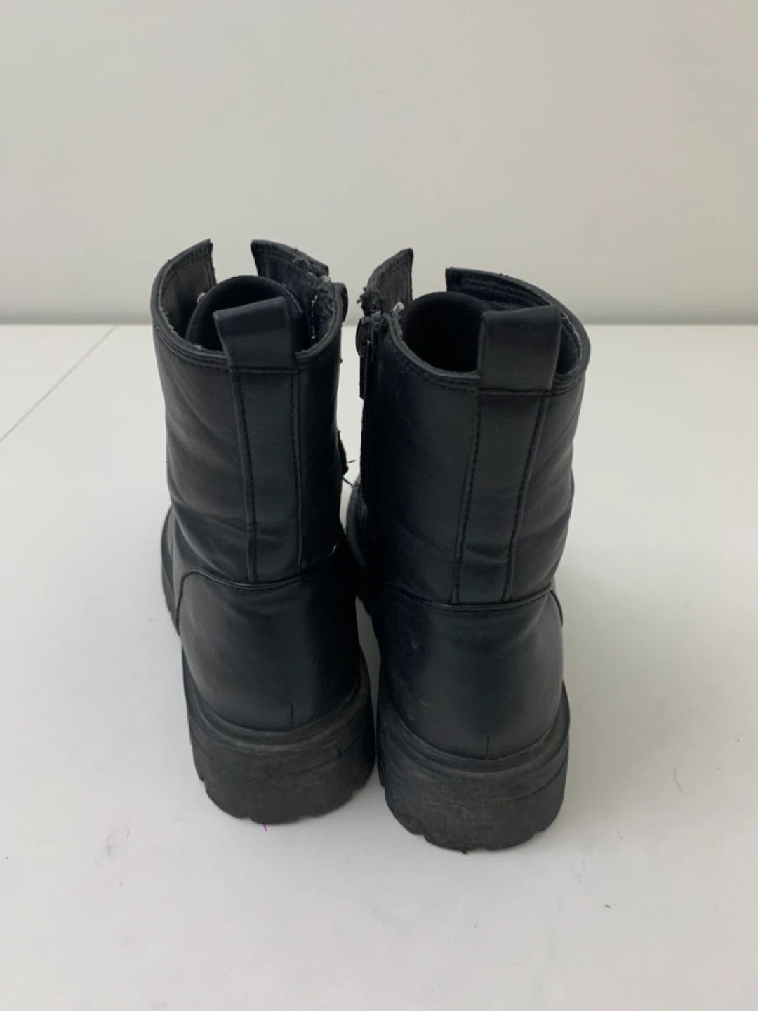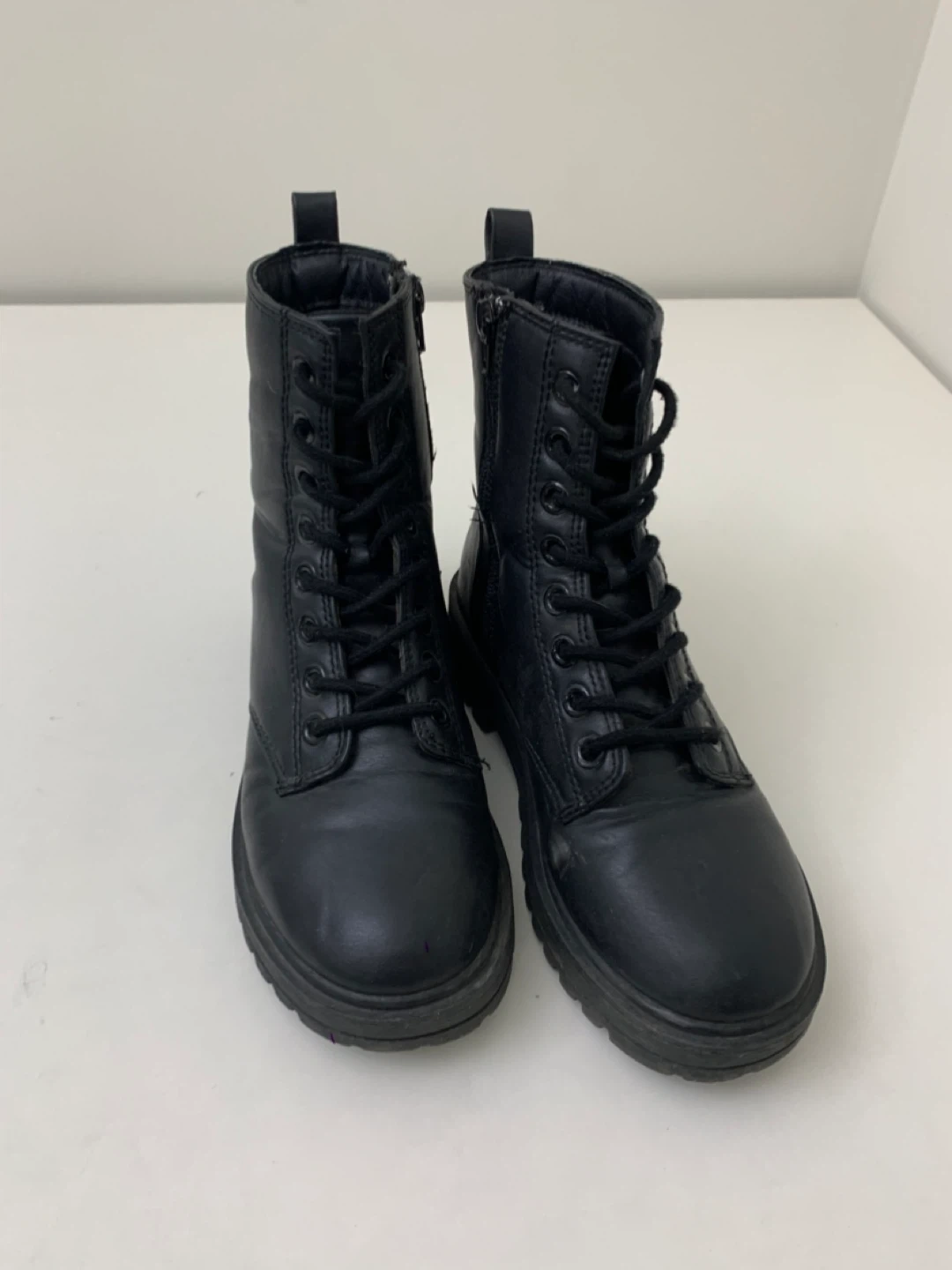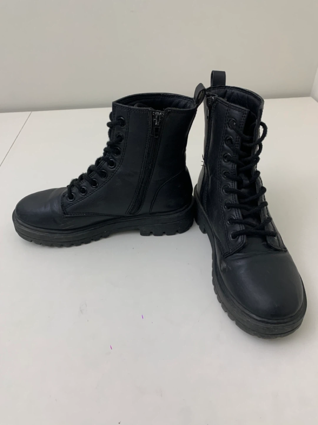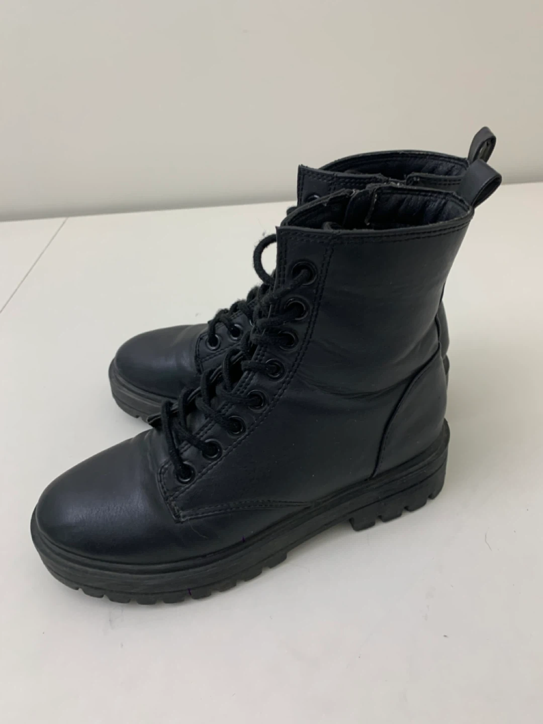 Selling a pair of black ankle boots. They feature a lace-up design with a side zipper for easy wear. These boots are in good condition and perfect for everyday wear!