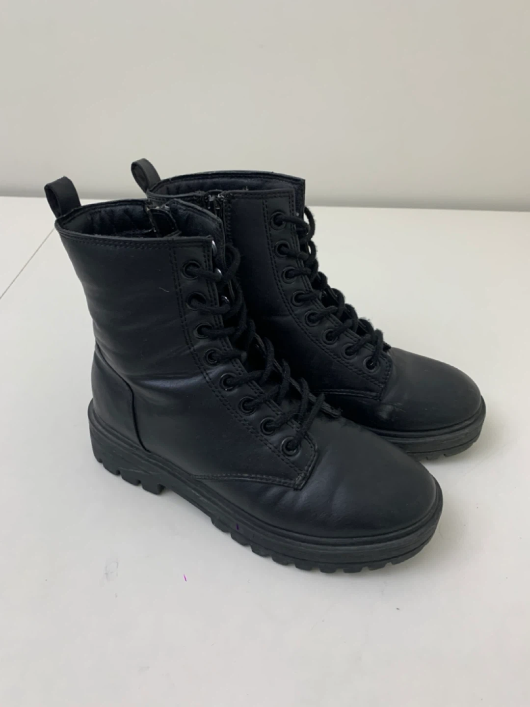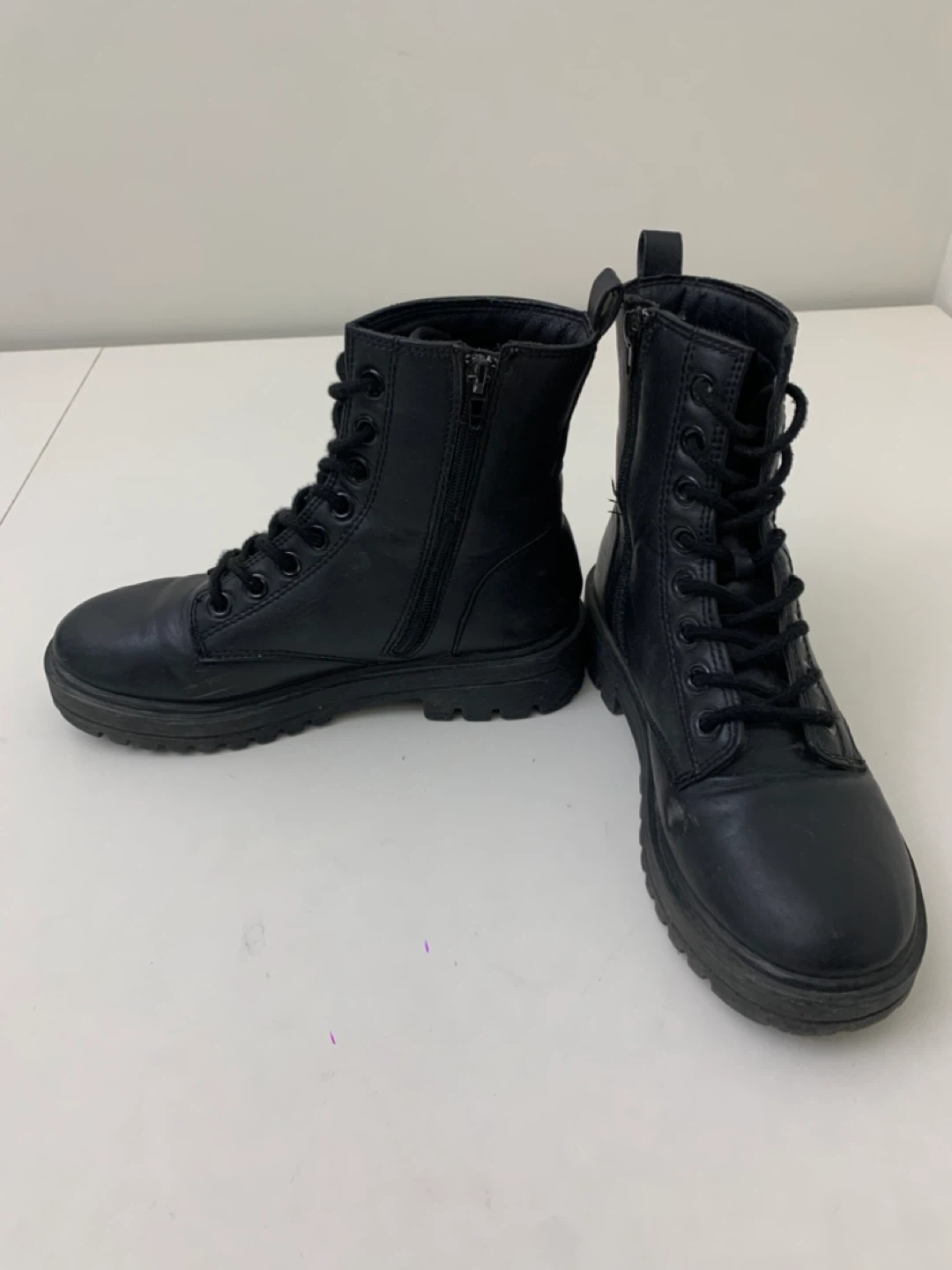 Selling a pair of black ankle boots. They feature a lace-up design with a side zipper for easy wear. These boots are in good condition and perfect for everyday wear!