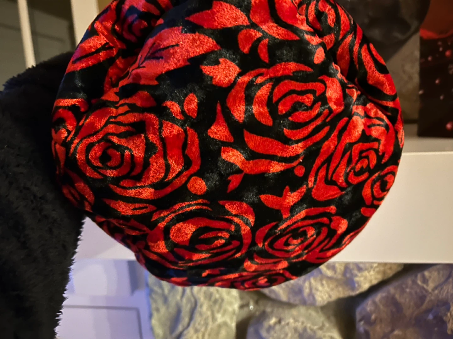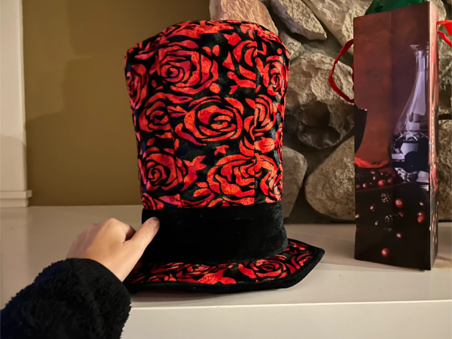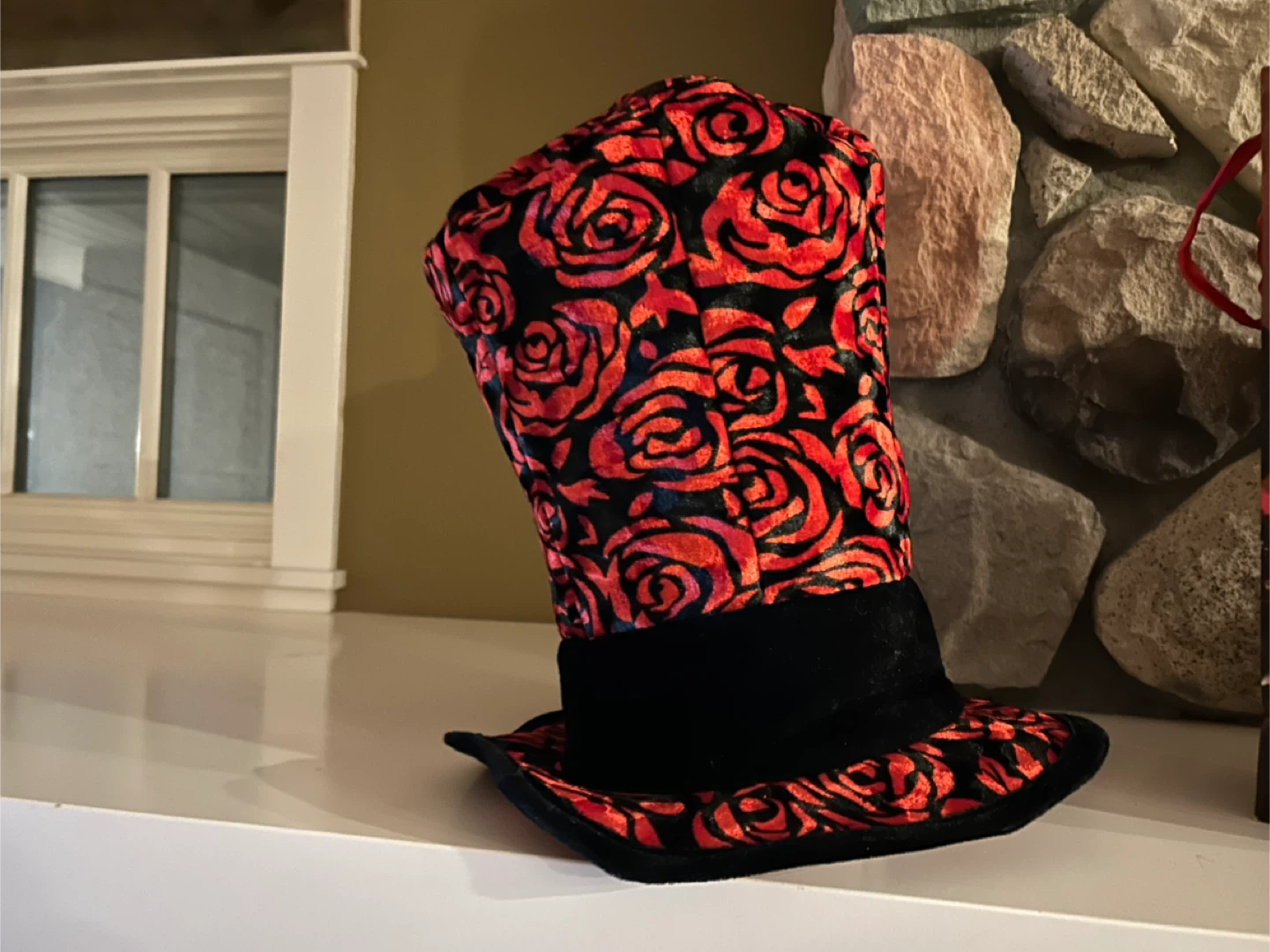 Selling a fun top hat with a vibrant red and black rose pattern! It's in great condition and would be perfect for a party or costume Cirque du Soleil hat