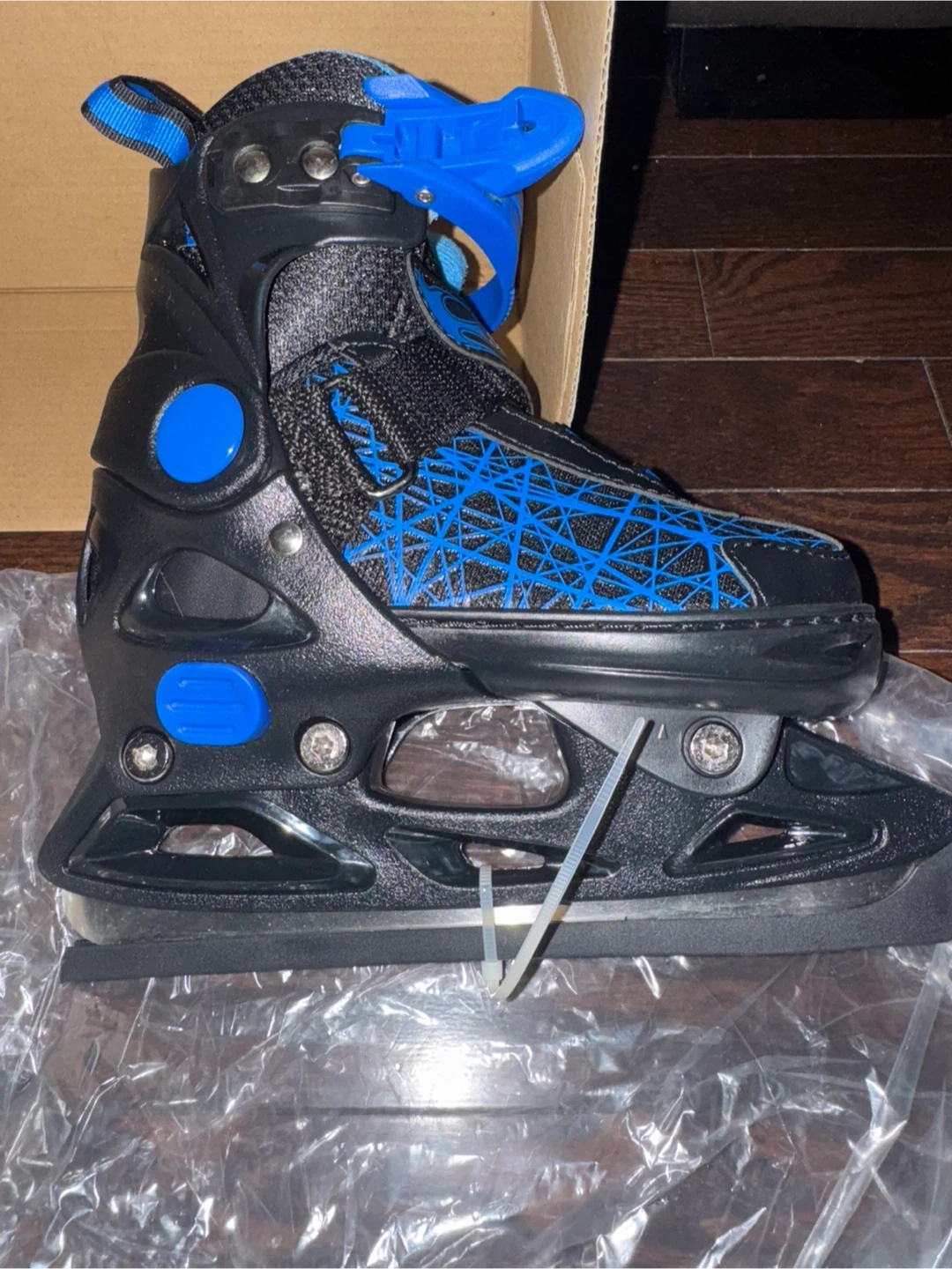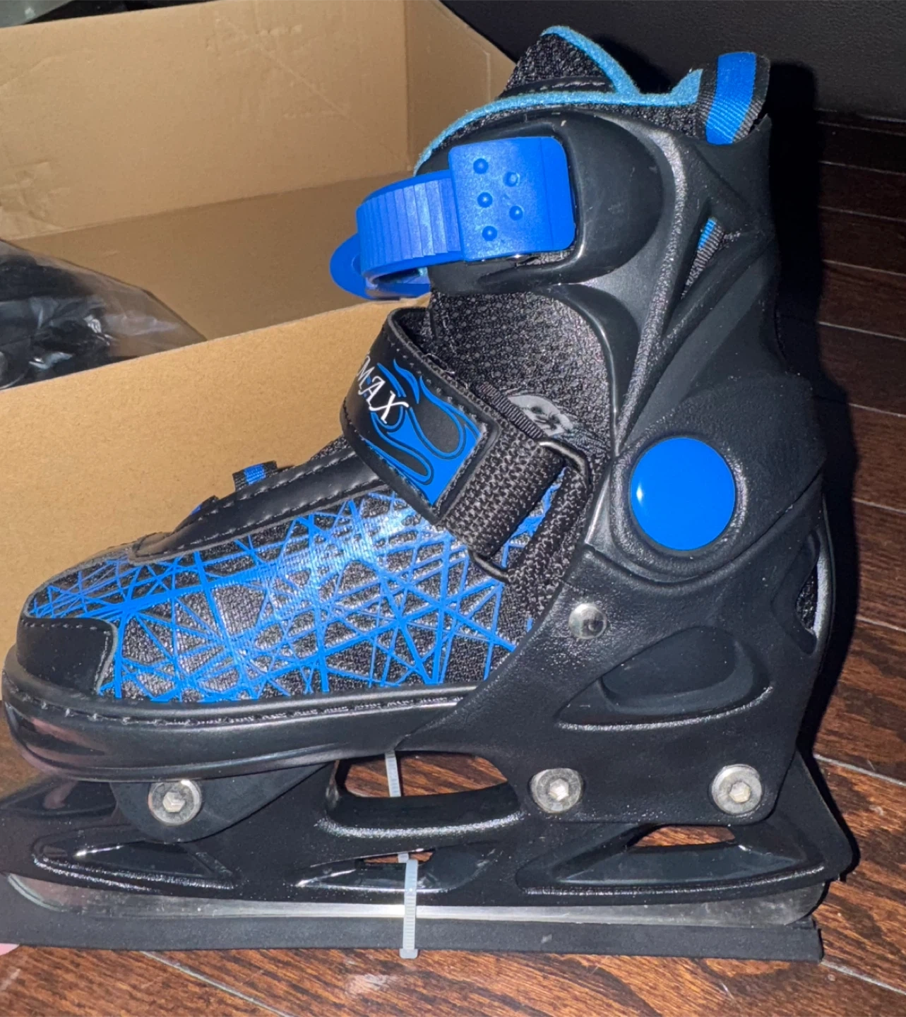 Selling a pair of Softmax adjustable skates in size XS (US Y10-Y13, EU 29-32). The model is PW223 BL. They are black with blue accents and come with the original box