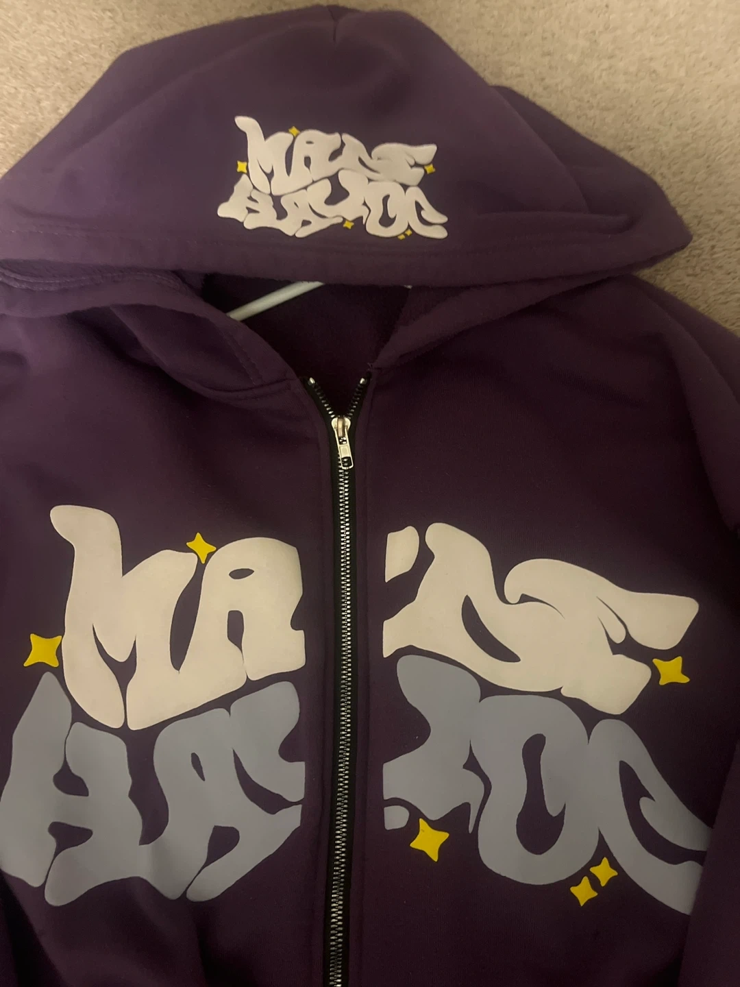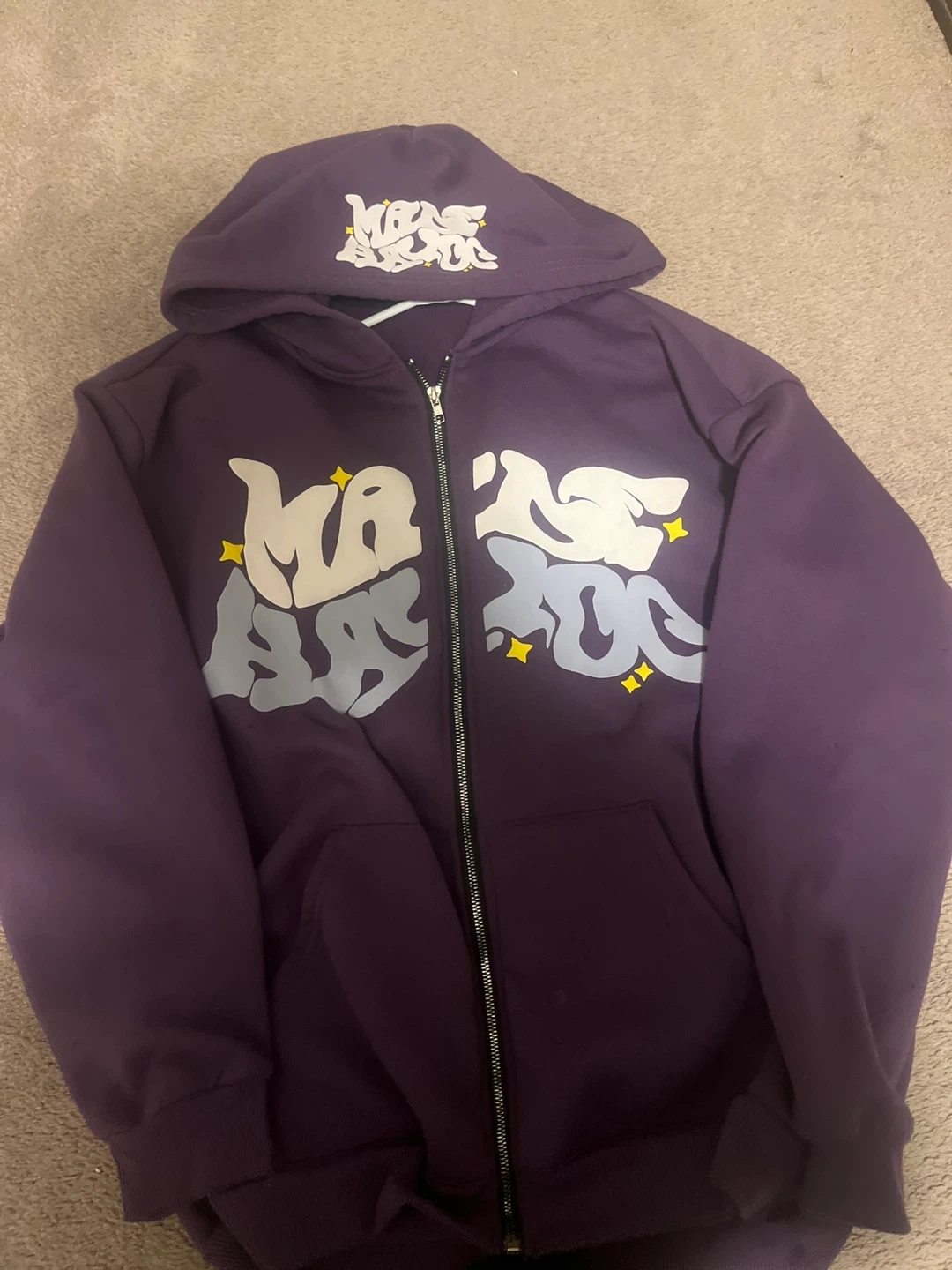 Selling a Maison Marc purple zip-up hoodie. It's in great condition and ready for a new owner! The hoodie features a unique design with the Maison Marc logo prominently displayed. It's a stylish and comfortable piece for everyday wear