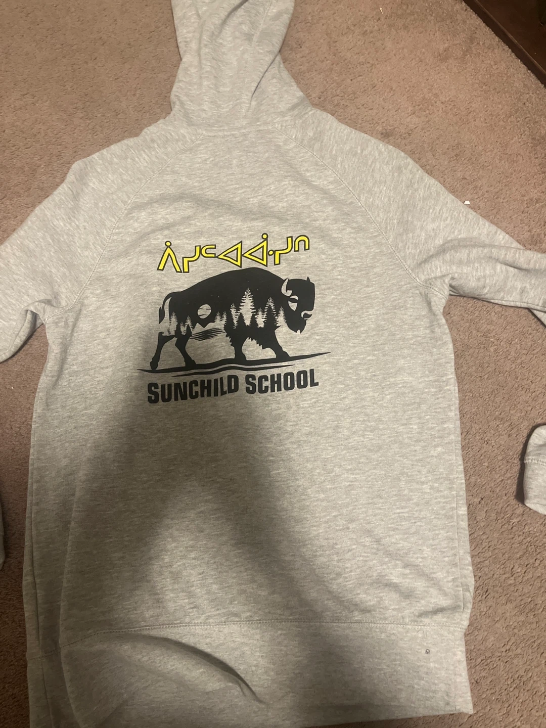 Selling a Sunchild School hoodie in grey. It features the school's logo with a bison and trees on the back, and a sun design on the front. The word 'Sunchild' is also printed on the sleeve