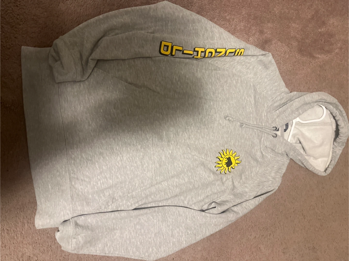 Selling a Sunchild School hoodie in grey. It features the school's logo with a bison and trees on the back, and a sun design on the front. The word 'Sunchild' is also printed on the sleeve