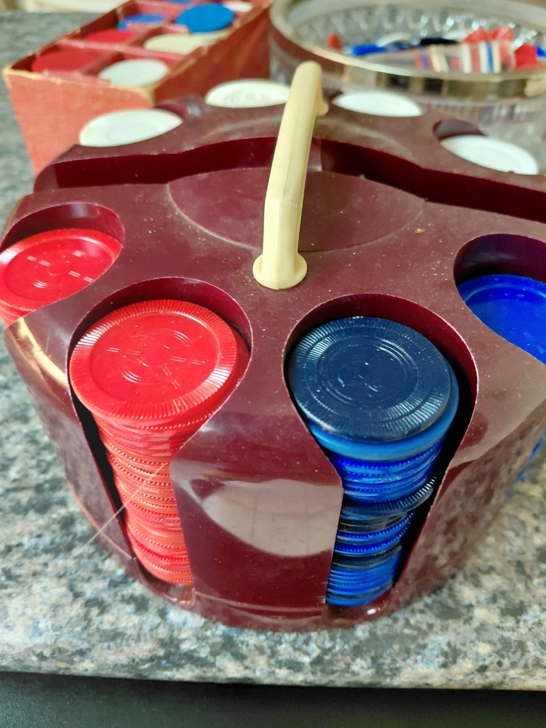 vintage poker chip set with a rotating case! The set includes a variety of red, white, and blue chips. The case is in good condition and has a handle for easy carrying. Perfect for game nights or adding to a collection
