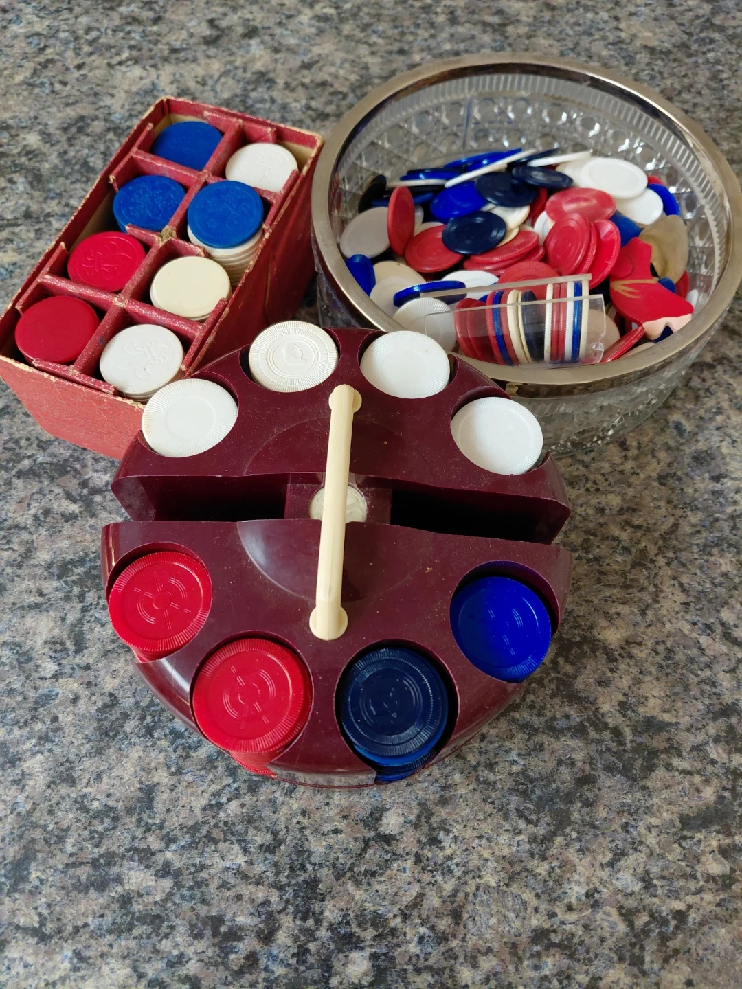 vintage poker chip set with a rotating case! The set includes a variety of red, white, and blue chips. The case is in good condition and has a handle for easy carrying. Perfect for game nights or adding to a collection