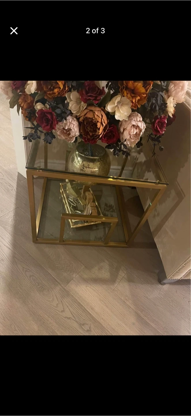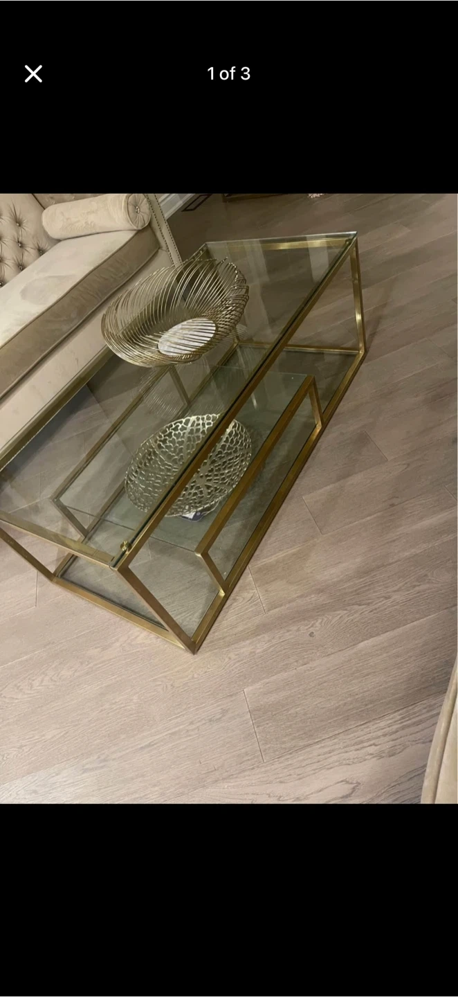 Selling a stylish coffee table with a gold frame and glass top. It’s in great shape and would look lovely in any living room!