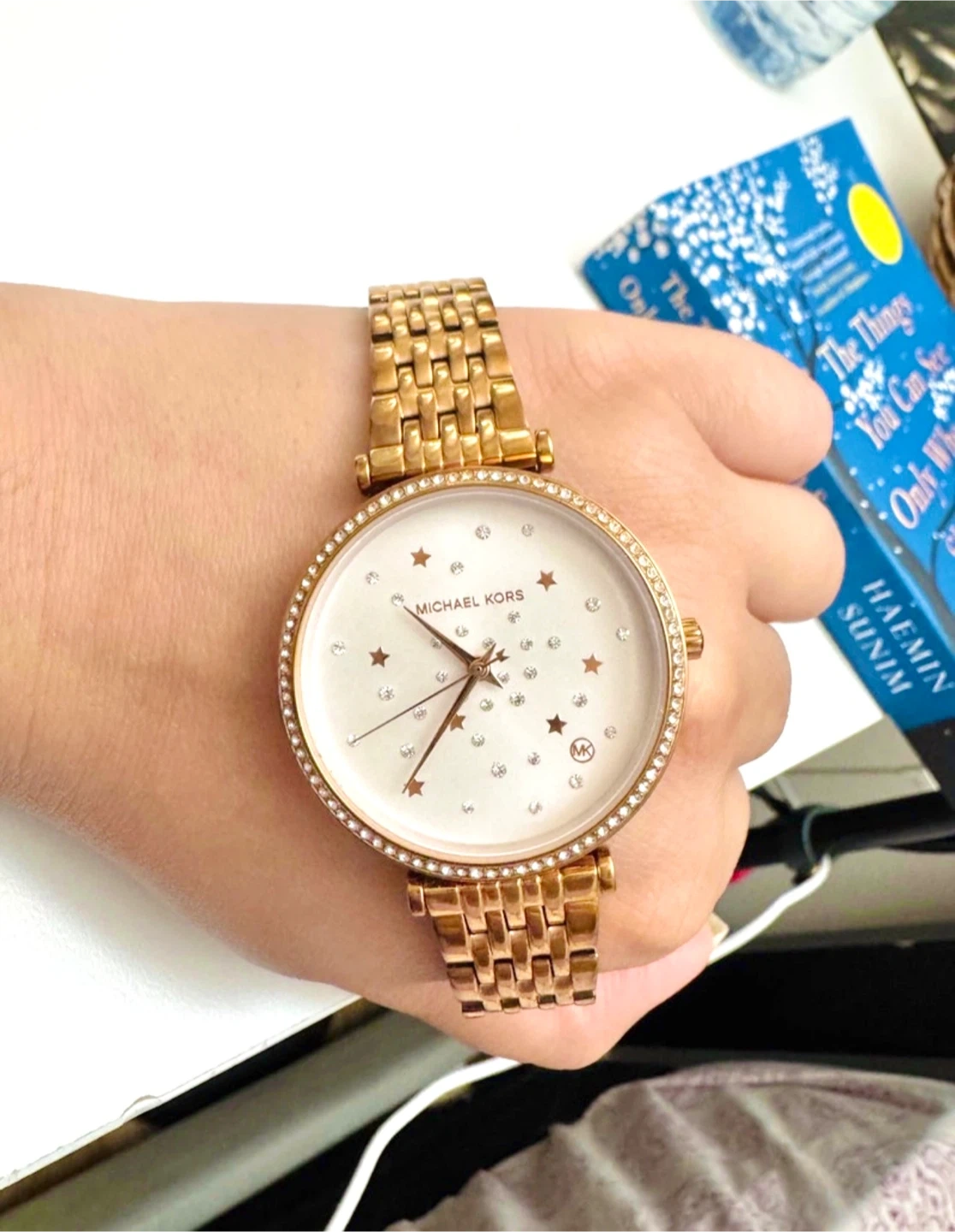 This is a Michael Kors Darci women’s watch in a stunning rose gold-tone, featuring a pavé-embellished bezel and a celestial-themed dial.
