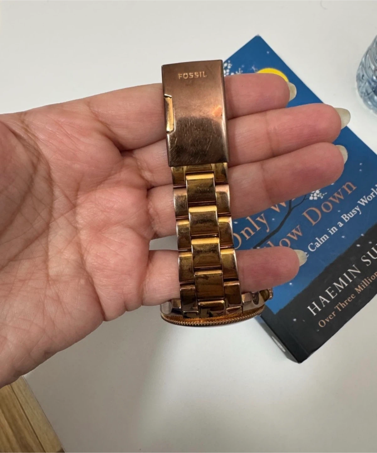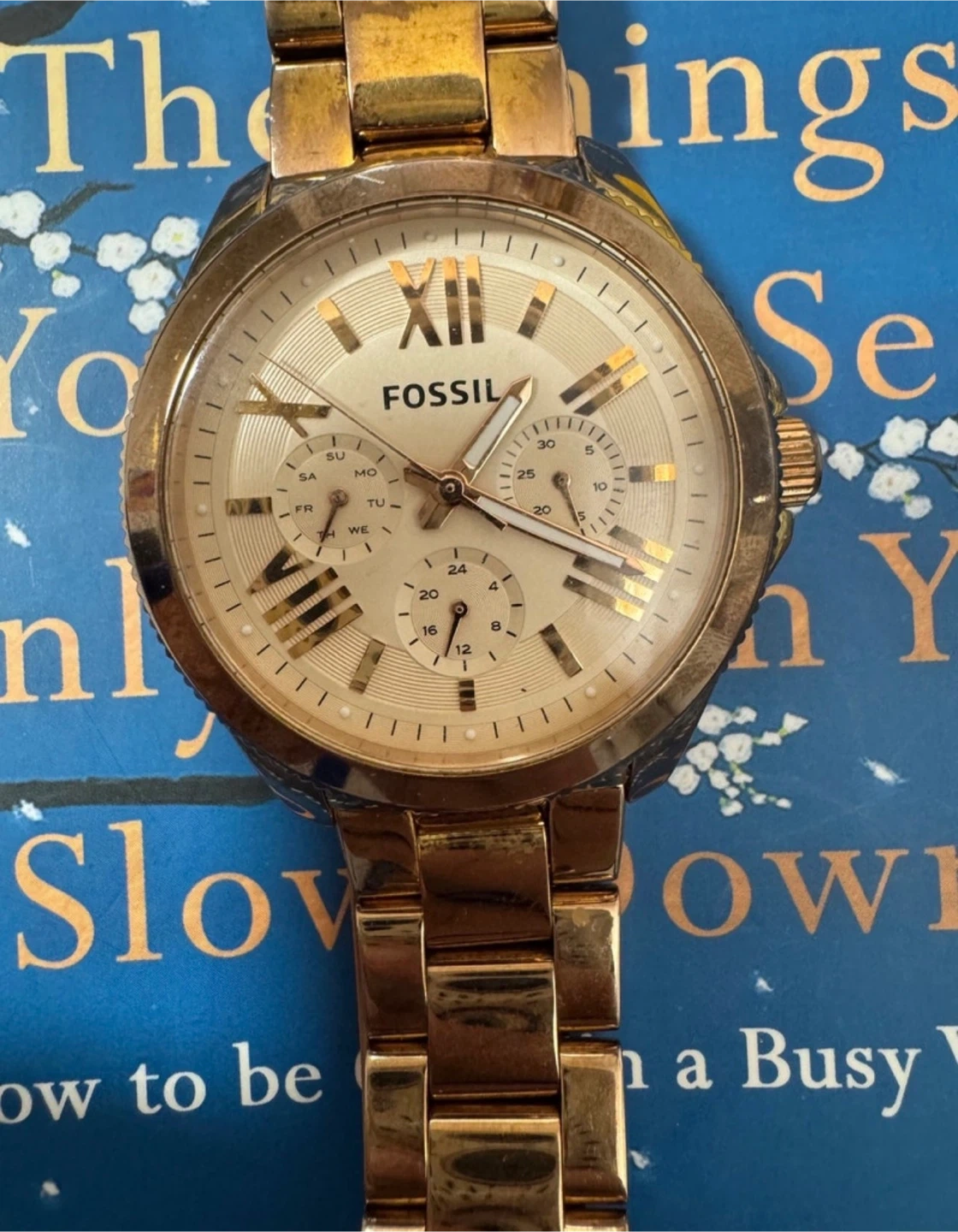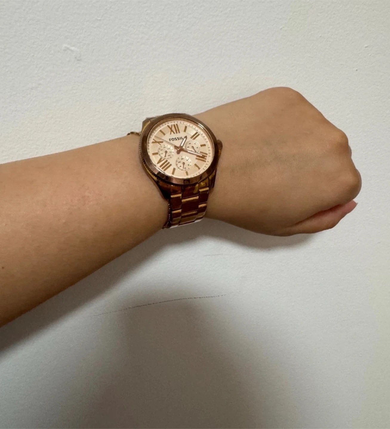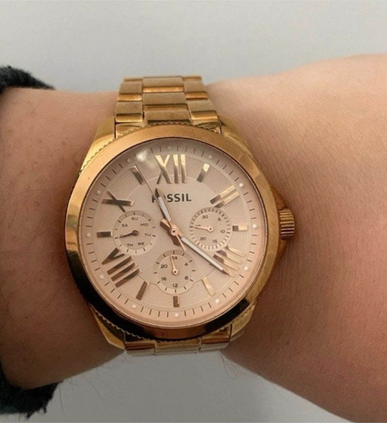 This is a Fossil Cecile AM4511 women’s watch in a stunning rose gold-tone, featuring a multifunction dial with three sub-dials that display the day of the week, date, and 24-hour time.