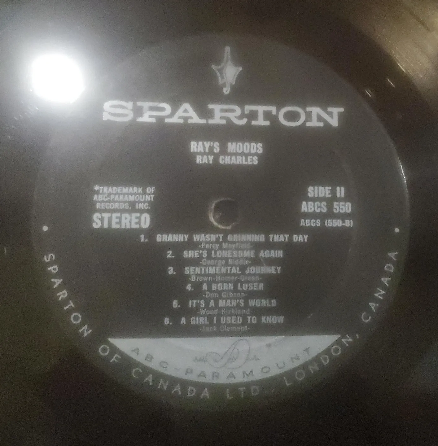 Selling a Sparton vinyl record of Ray Charles' Ray's Moods. It's a stereo record, Side II, ABCS 550. The record includes songs like: